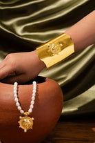 Bold and regal, the Shera Cuff Bracelet features an intricately detailed tiger motif in 18k matte gold plating, symbolising power and confidence. Handcrafted in recycled brass with an adjustable open cuff, it is hypoallergenic and nickel-free.
