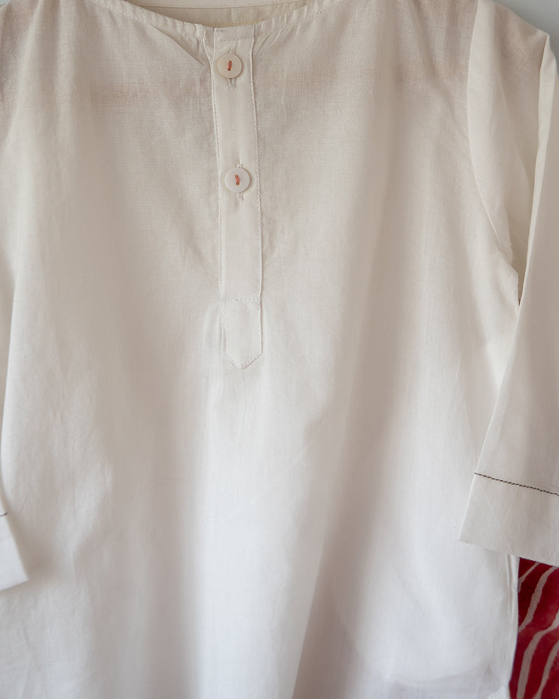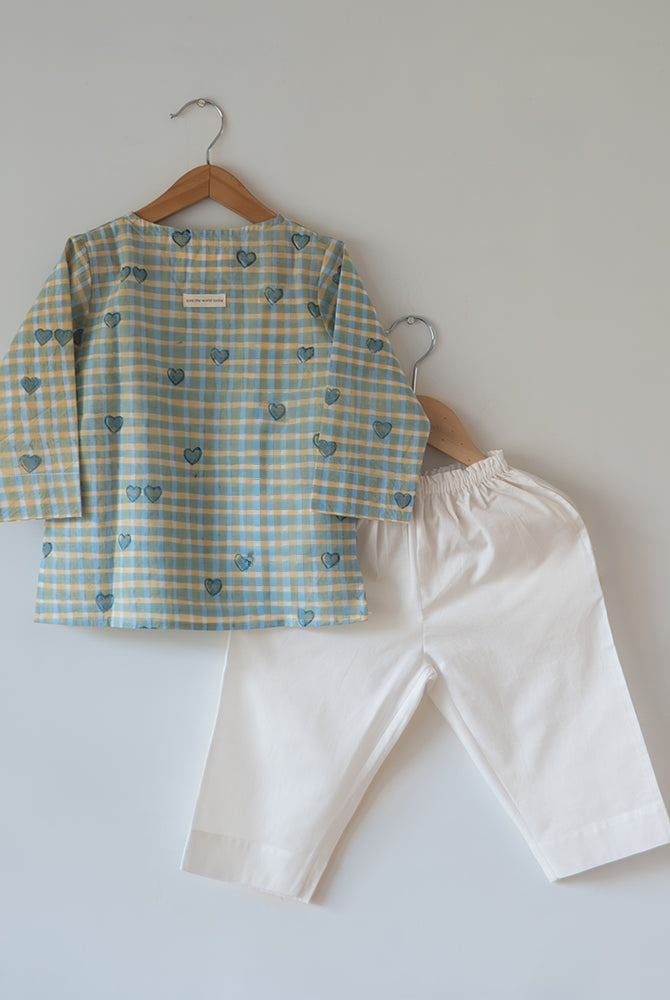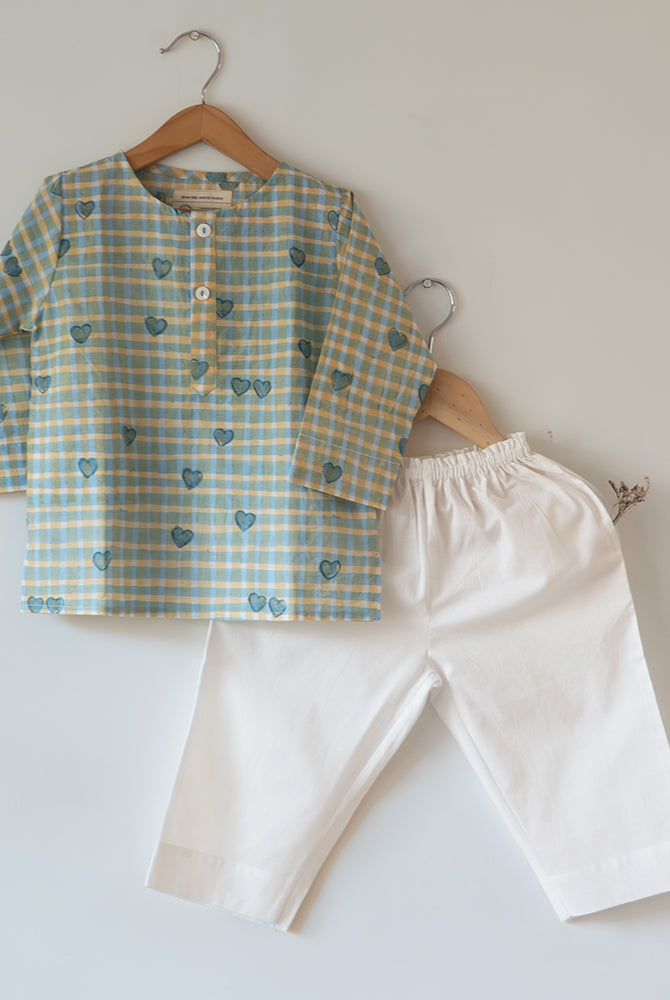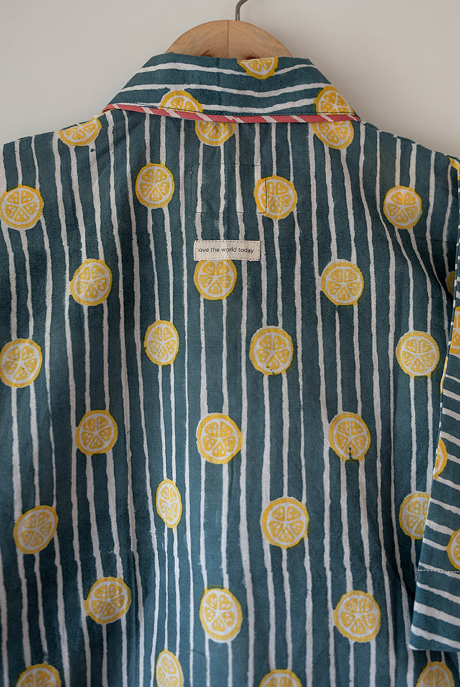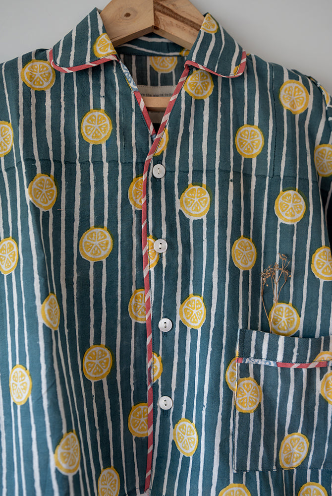 Embrace comfort and conscious style with this unisex co-ord set crafted from GOTS certified organic cotton. The full-sleeve kurta features natural shell buttons and practical pockets, while the hand block-printed shorts showcase the artisanal work of Jaipur craftspeople. An elasticated waistband ensures ease of movement, and distinctive up-cycled hand-embroidered patches adorn the back, adding character and sustainability to your wardrobe. Perfect for relaxed evenings or casual gatherings.