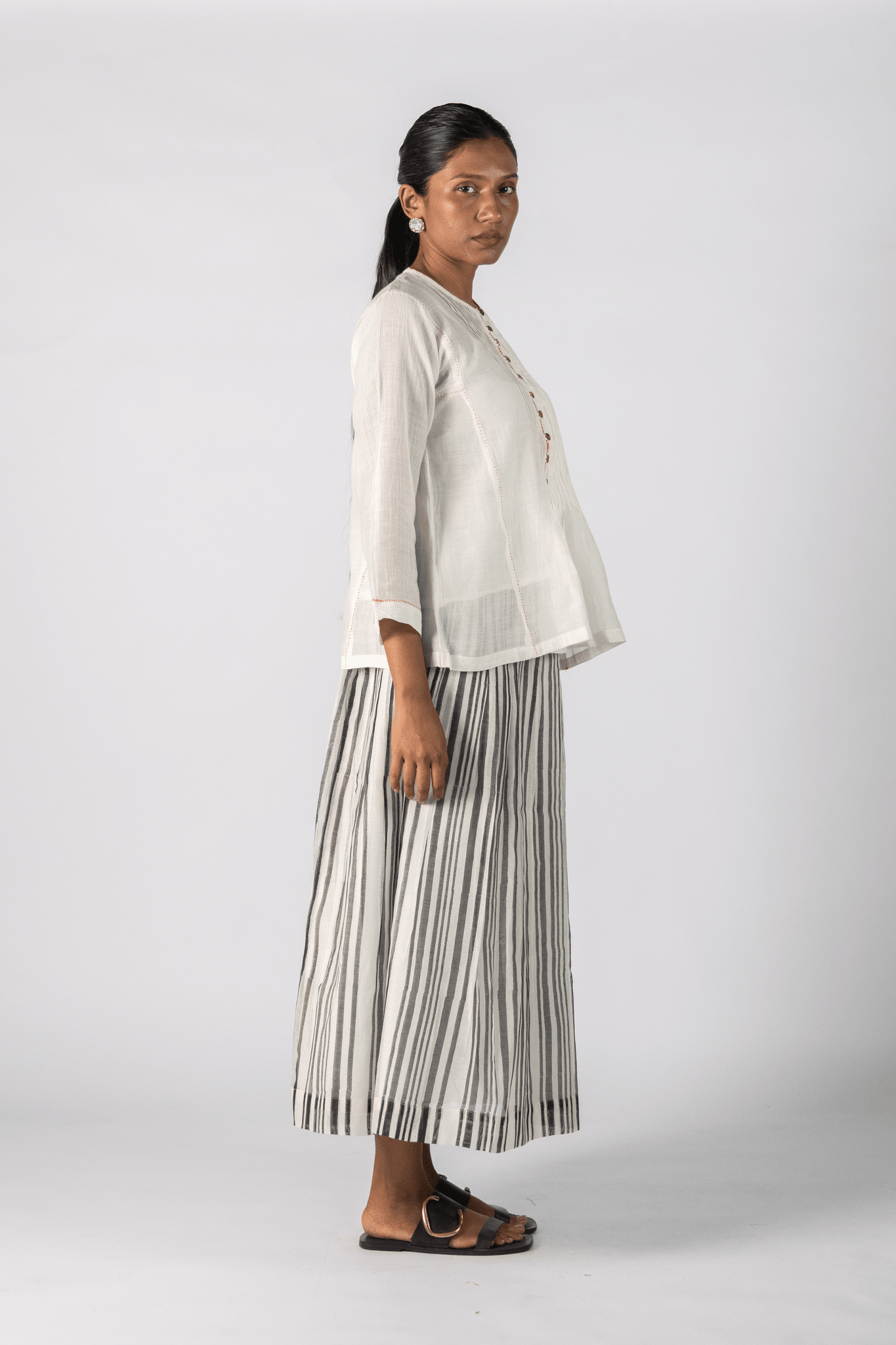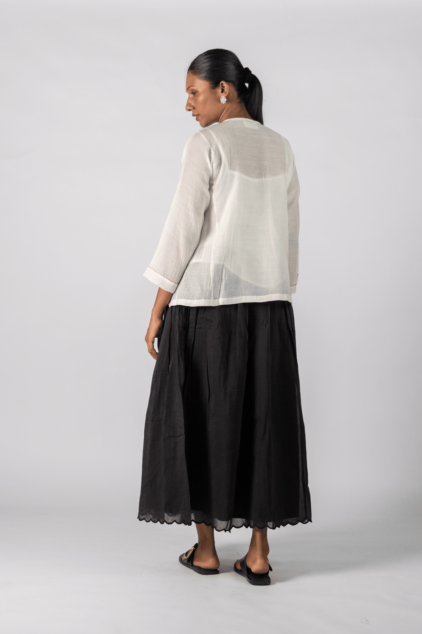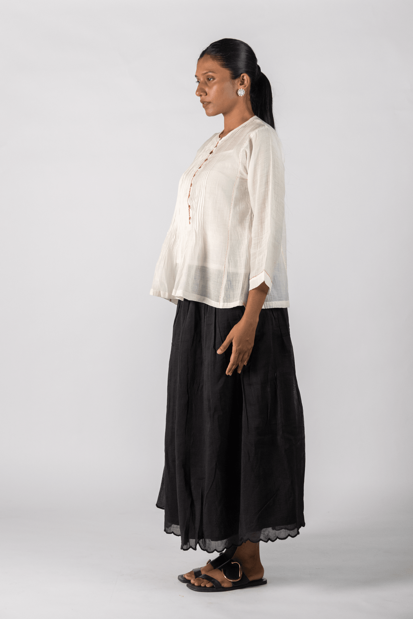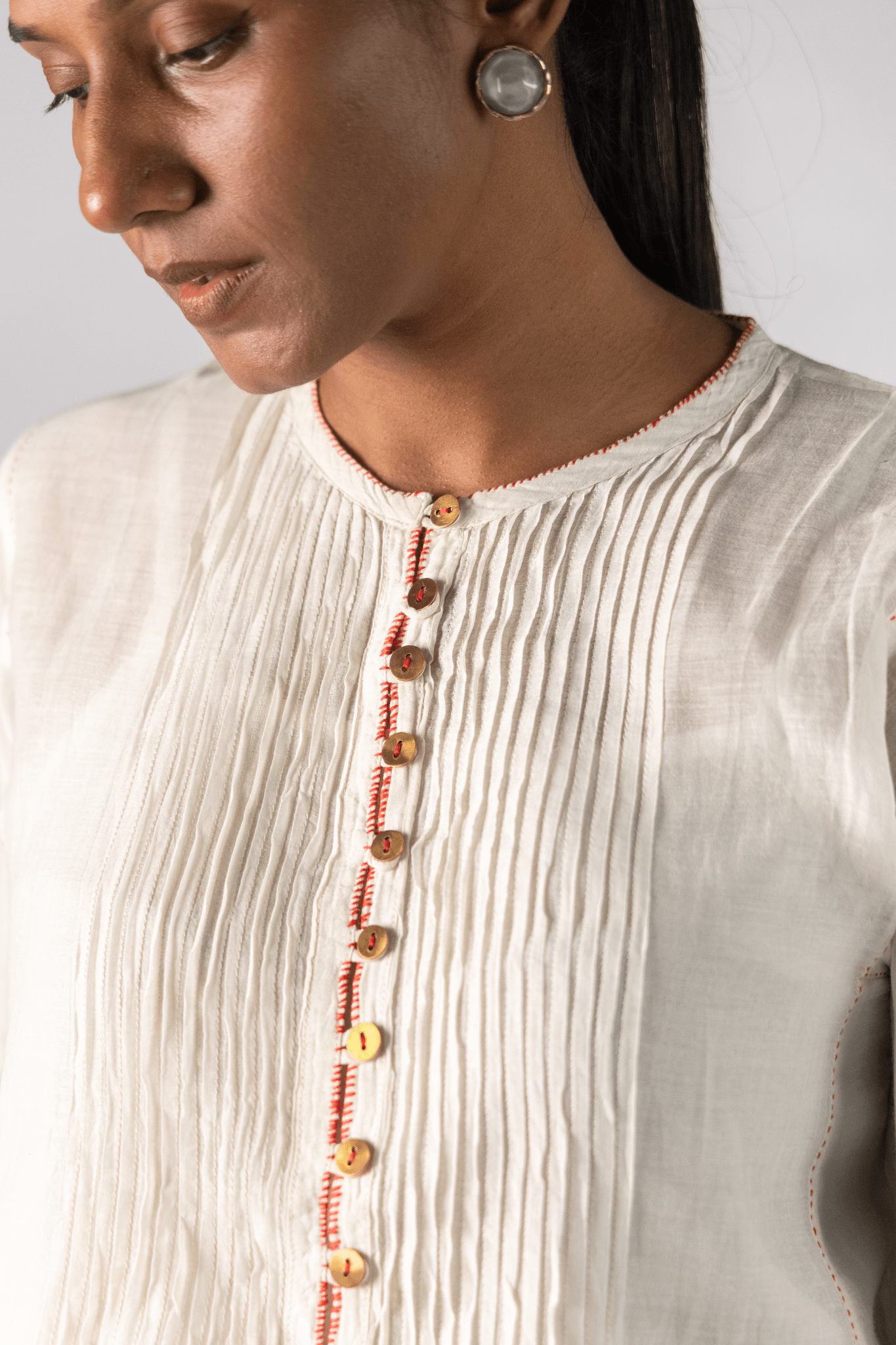 Crafted in lightweight Mul Chanderi (cotton–silk blend), this off-white top features soft pleating, a round neck with a half placket and button loop closure, and delicate contrast hand embroidery. The 3/4 sleeves and breathable cotton slip ensure effortless all-day comfort.