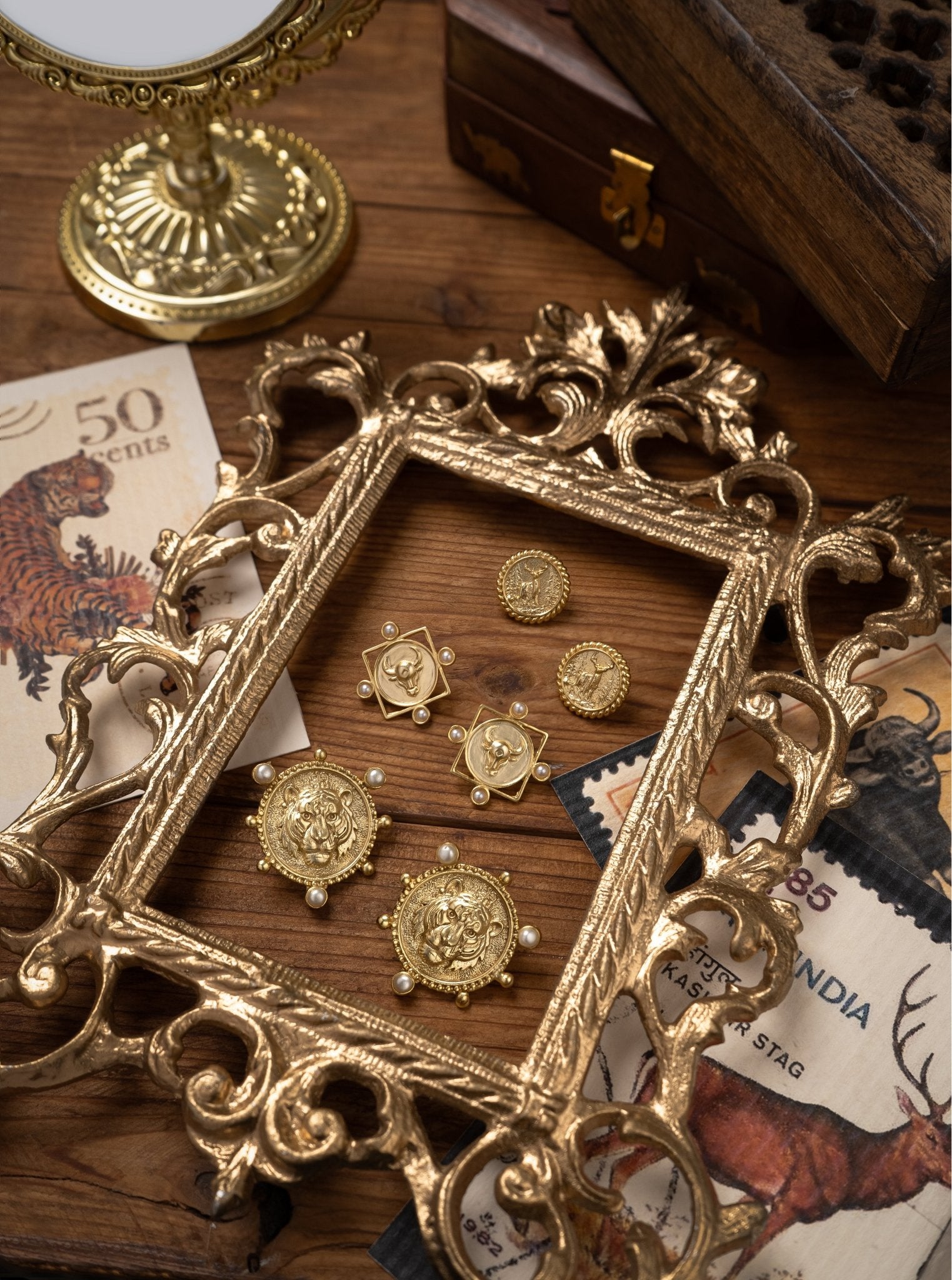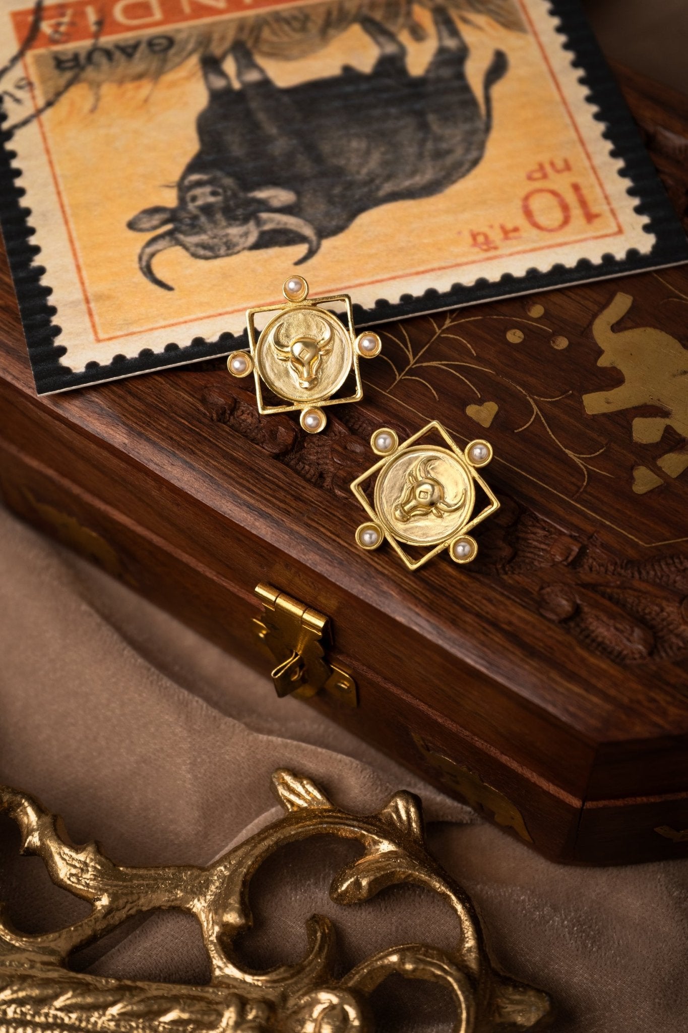 Inspired by the Indian bison, the Gaura Earrings symbolise strength and resilience. Handcrafted in brass with 18k gold plating, they feature natural gemstones and freshwater pearls, celebrating Indian craftsmanship.