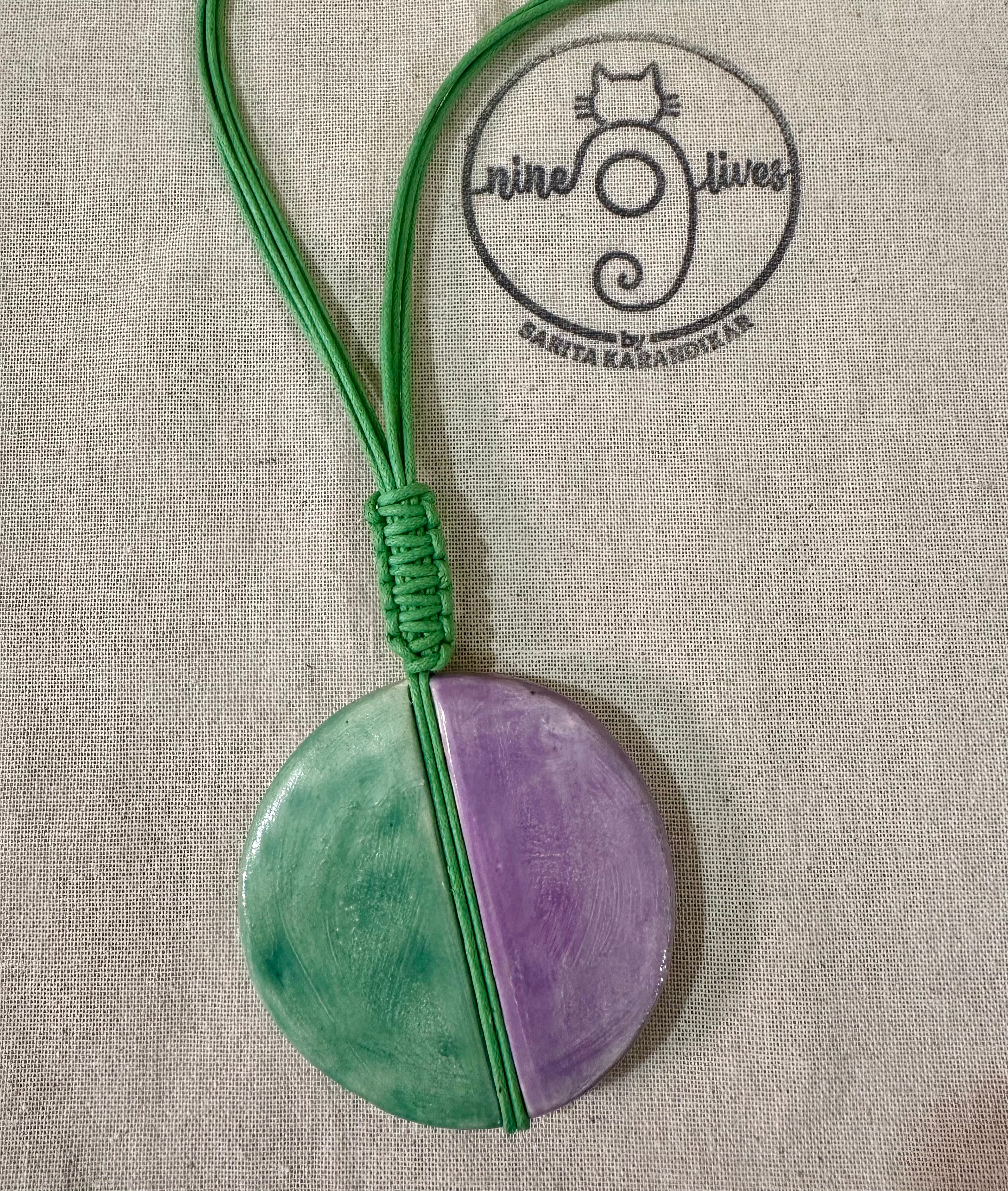 Half N Half Neckpiece is an artisanal statement neckpiece crafted from stoneware, featuring a striking mint and mauve ceramic pendant. The dual-tone design creates visual intrigue, while the piece is suspended on supple green waxed cotton cord for comfortable everyday wear. A limited edition offering that bridges contemporary aesthetics with handcrafted elegance, this neckpiece serves as a distinctive accessory for those seeking refined, understated luxury.