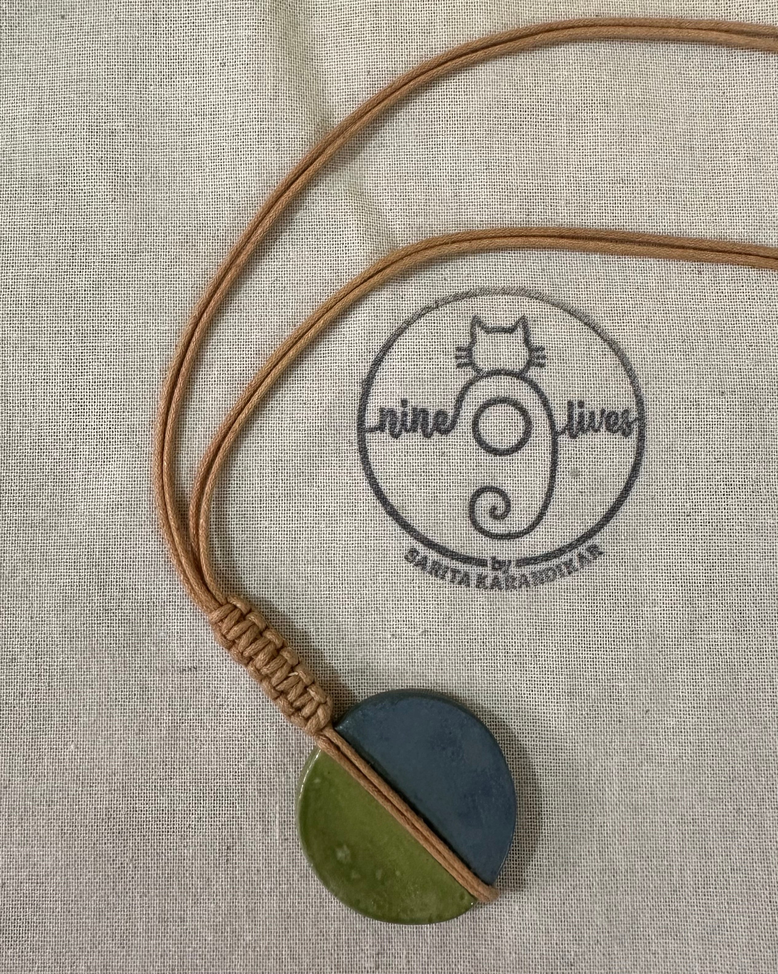 A striking limited edition neckpiece that commands attention. This artisanal ceramic pendant features a distinctive half-and-half design in cool blue-grey and mint tones, handcrafted from stoneware for authentic texture and depth. Suspended on supple tan waxed cotton cord, it balances sculptural presence with understated elegance—a versatile statement piece that elevates both casual and refined wardrobes.