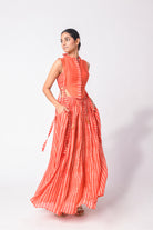 The Coral Yoke Co-Ord Set features a block-printed Chanderi bralette and skirt with a detachable button yoke overlay for versatile, elegant styling.
