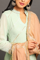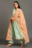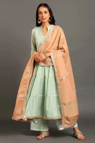 Elevate your ethnic style with this refreshing mint green kurta set, crafted in ultra-soft mulmul fabric. The flared, tiered silhouette offers graceful movement, enhanced by delicate gota detailing. The kurta features subtle diagonal stitch detailing and three-fourth sleeves for added charm. Paired with a matching palazzo and a contrasting peach dupatta adorned with zari and gota accents.
