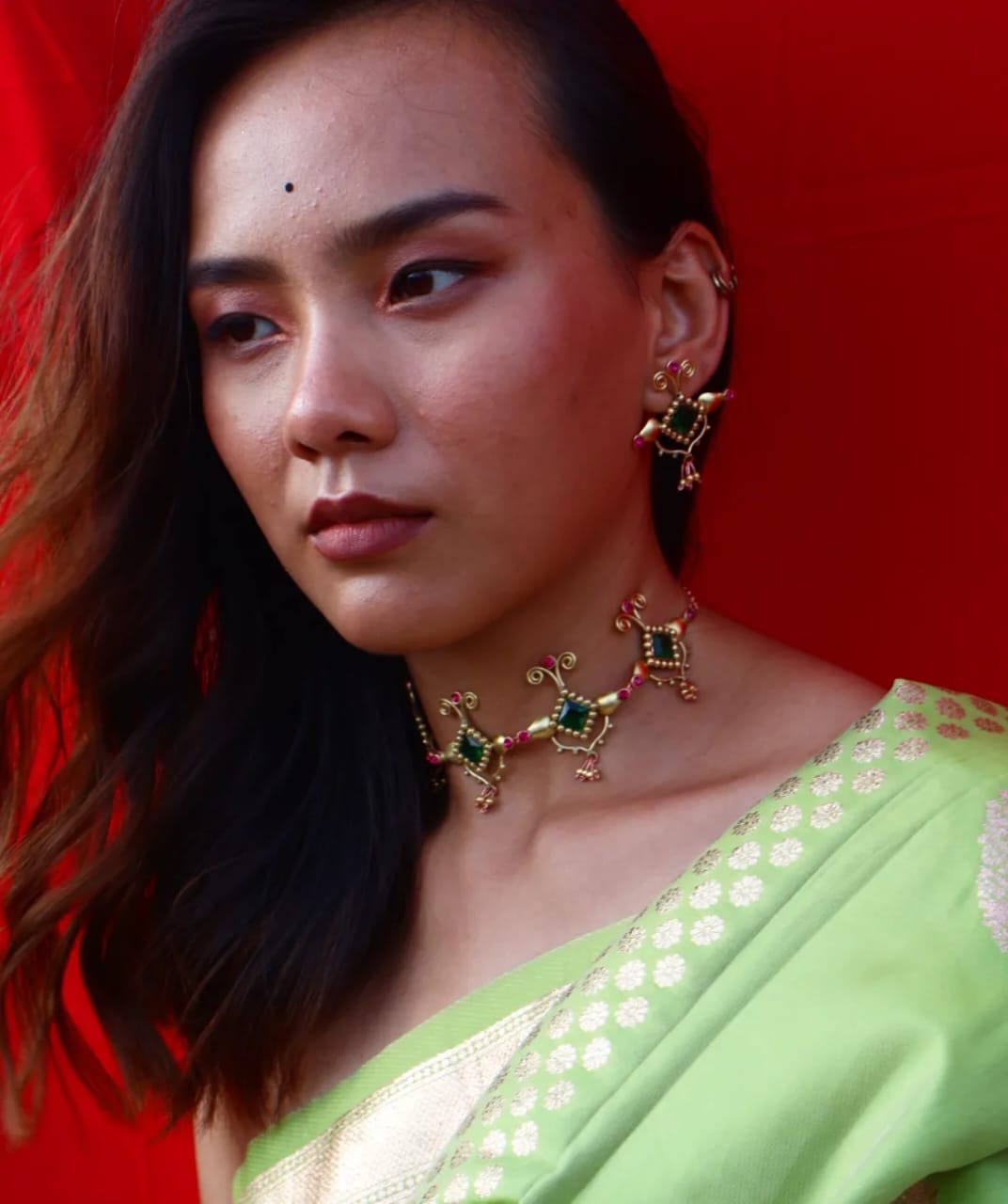 Inspired by classic Bengal wedding embroidery patterns, this set features intricate stonework detailing that echoes timeless bridal traditions. This piece captures the elegance of authentic naksha craftsmanship, bringing heritage artistry to contemporary wear.