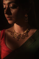 Rukmini Necklace honors the intricate legacy of traditional korat craftsmanship. Delicate white pearls and soft pink stones are meticulously set within golden brass, each detail reflecting centuries of artisanal technique. The design celebrates the precision and grace inherent to this heritage craft, creating a piece that bridges classical Indian artistry with contemporary refinement. Ideal for those who value cultural depth and seek jewelry that tells a story of tradition, skill, and timeless beauty.