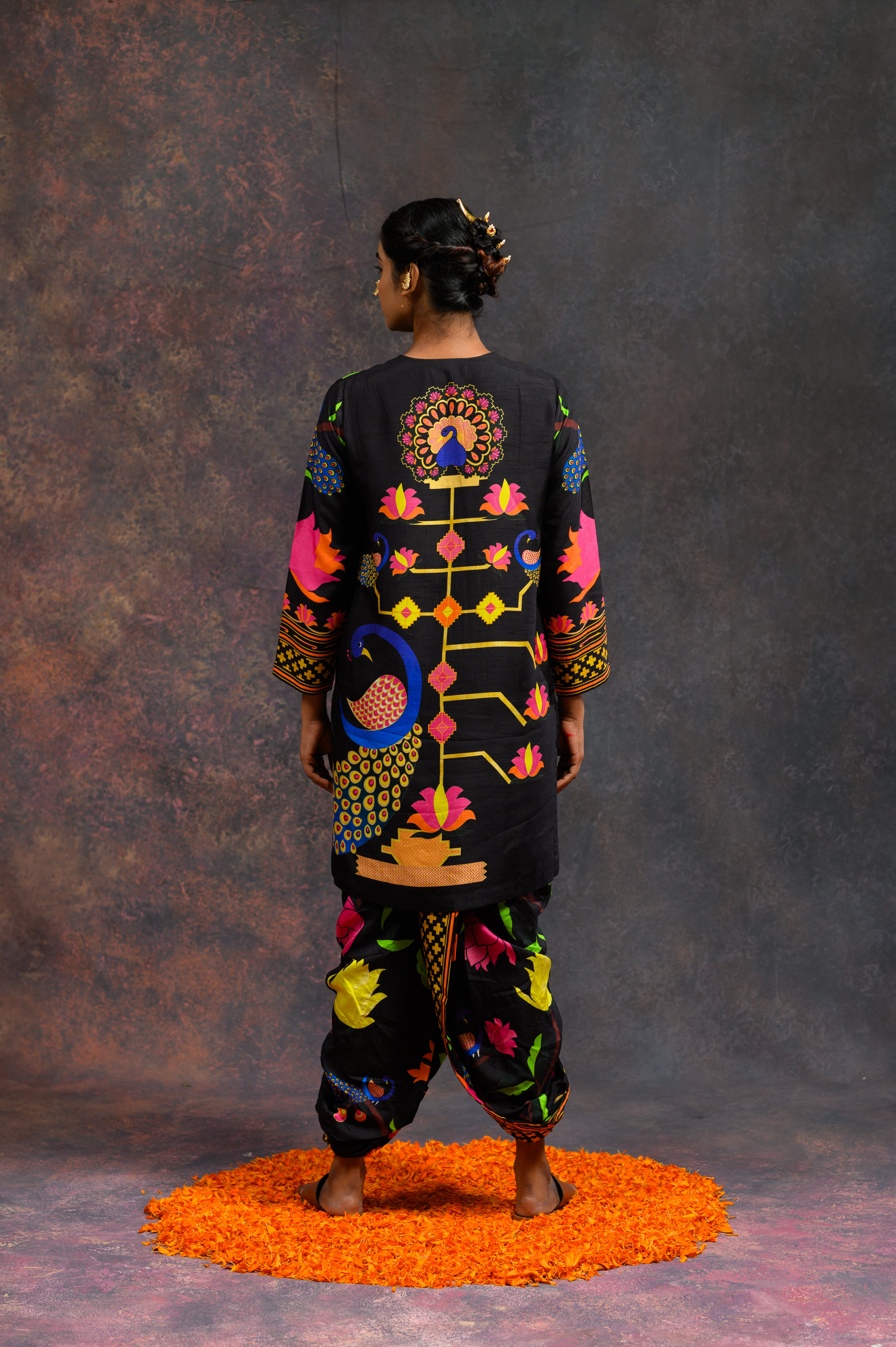 Elevate your traditional wardrobe with the Kalamkari Black Kurta Set, featuring a straight-cut long kurta adorned with an intricate ornamental design on the back. Paired with dhoti-styled salwar, this ensemble creates a regal and refined silhouette perfect for special occasions or cultural celebrations. The thoughtful combination offers both comfort and elegance, making a sophisticated statement with every wear.