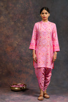 The Morbagh Pink Dhoti Set features a long straight-cut kurta with a refined geometric grid pattern that enhances its structured silhouette. Paired with narrow dhoti-style pants, this ensemble offers a contemporary yet traditional look, perfect for those who appreciate elegant craftsmanship and modern design in ethnic wear.