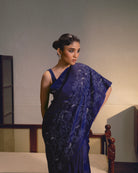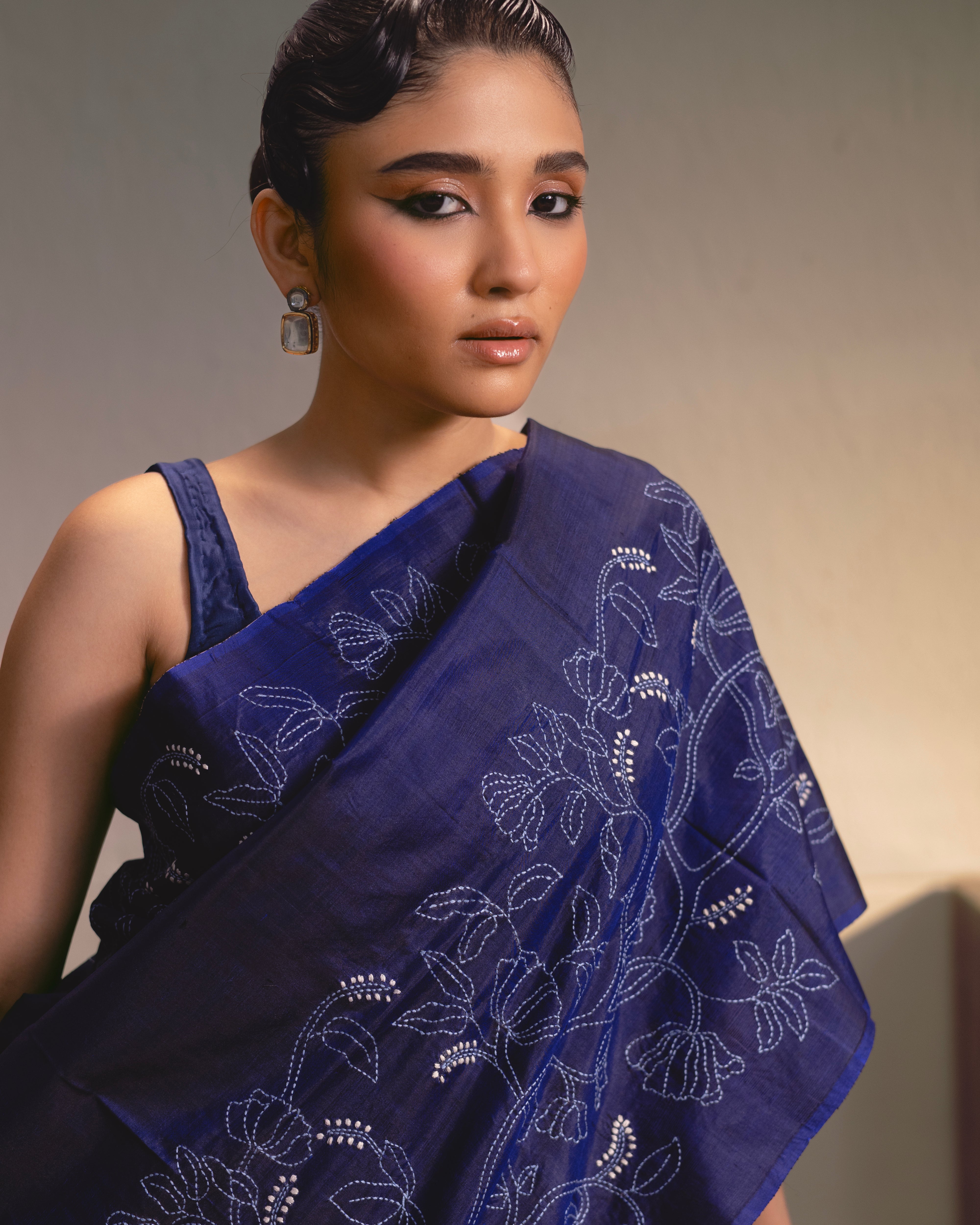 Chaiti in navy blue is a masterpiece of artisanal craftsmanship, where dense kantha embroidery blooms across sumptuous silk like a midnight garden. Each stitch tells a story, each floral motif a carefully considered detail that speaks to refined taste. This is a collector's saree, one that rewards close attention and celebrates the beauty of handcrafted heritage with quiet, enduring elegance.