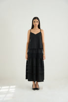 The multi purpose black beauty skirt is crafted with vegan silk fabric with multiple lace & pleat detail paired with strap vegan silk top with neck detailing.