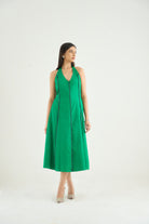 The imperial halter dress is crafted from vegan silk fabric, The dress has beaded detailing in the seamline adding a playful touch to the silhouette.