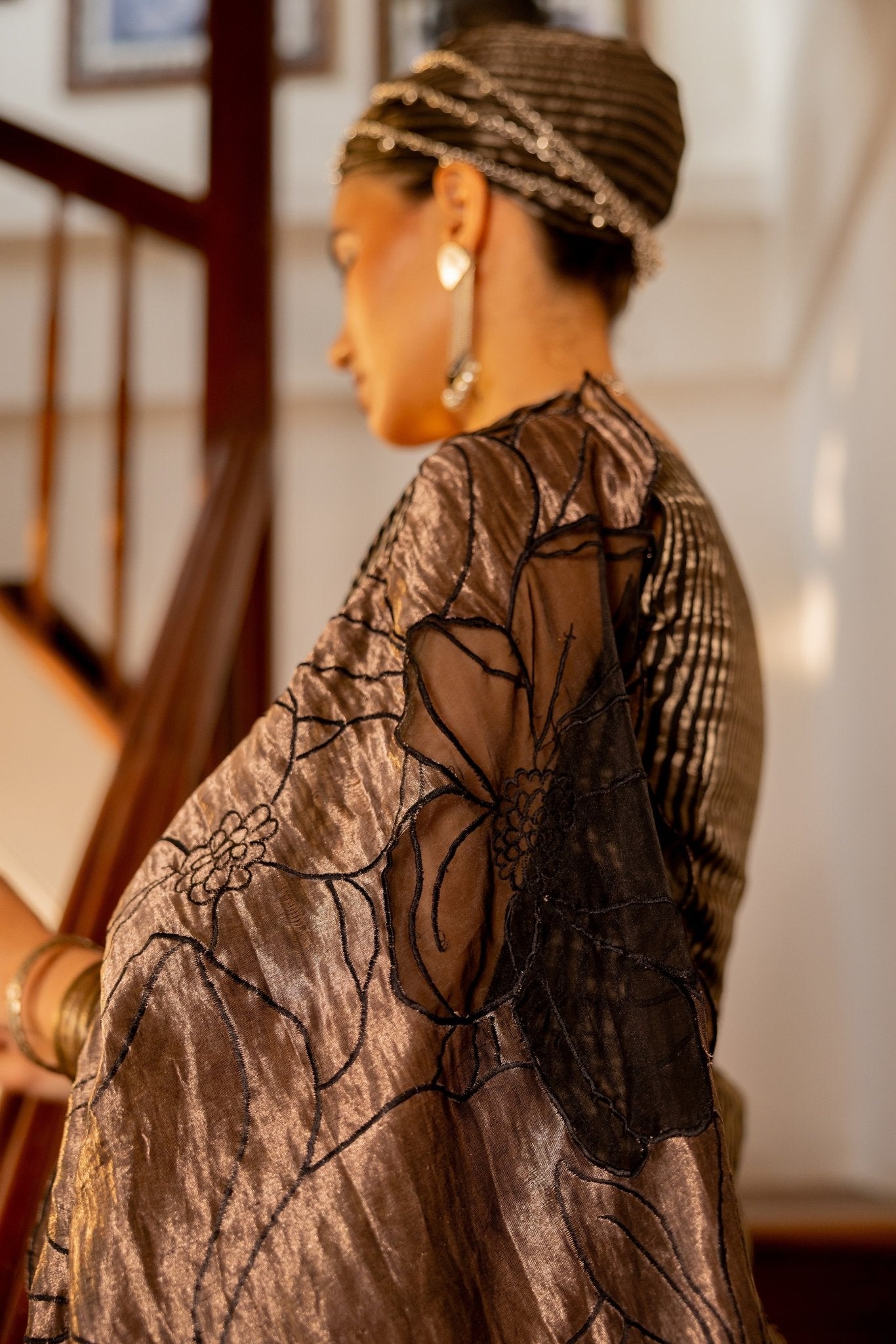 The Kali Set reimagines saree styling with a pre-draped design and attached pallu in elegant black. Featuring delicate resham embroidery and cut work, it's crafted from pure Banaras and Chanderi silk tissues with cotton silk lining. The matching Chanderi blouse offers a V neckline and side zip closure, while the inner skirt provides secure fastening. Modern sophistication meets traditional artistry in this three-piece ensemble.