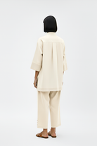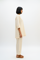 Elevate your everyday style with this timeless ivory co-ord set, where refined details showcase exceptional craftsmanship. The top features delicate stitch lines tracing the sleeves and hem, paired with a wooden button accent positioned on the side seam for subtle visual interest. The coordinating pants echo this attention to detail with wooden button embellishments at the hem. This versatile ensemble effortlessly bridges casual and formal occasions, offering understated elegance for any setting.