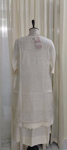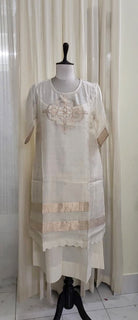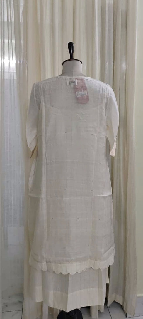 Elevate your wardrobe with this elegant Scallop Dress, crafted from handwoven cotton silk Jamdani fabric. Featuring delicate white and gold Zari stripes, its straight fit is enhanced by refined scallop detailing. This versatile piece can be styled effortlessly as a dress or paired with pants for a polished, sophisticated look.