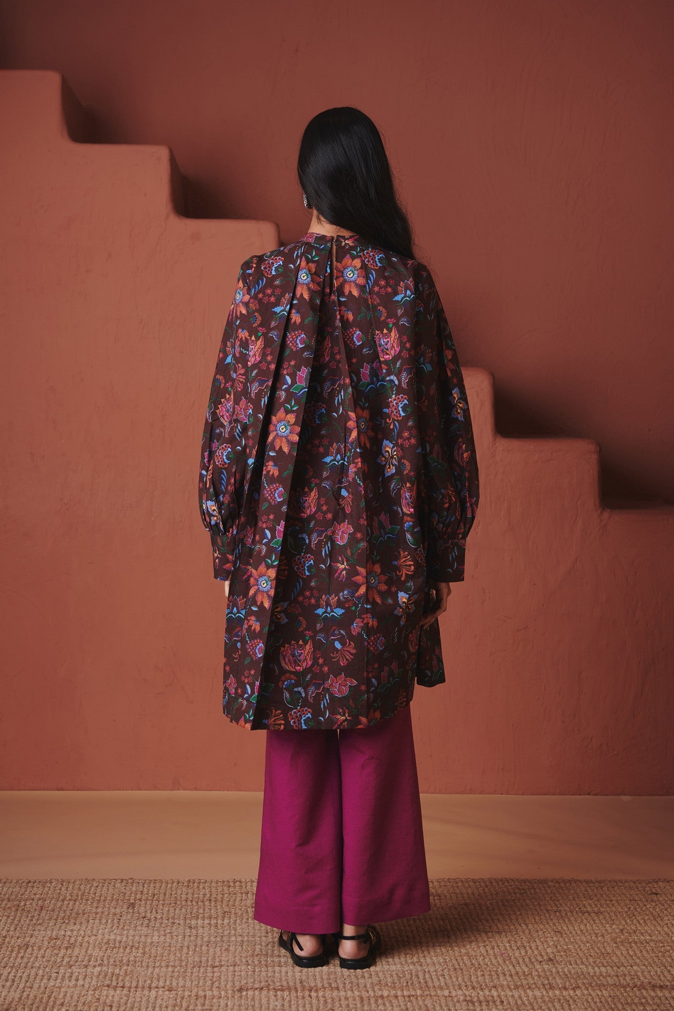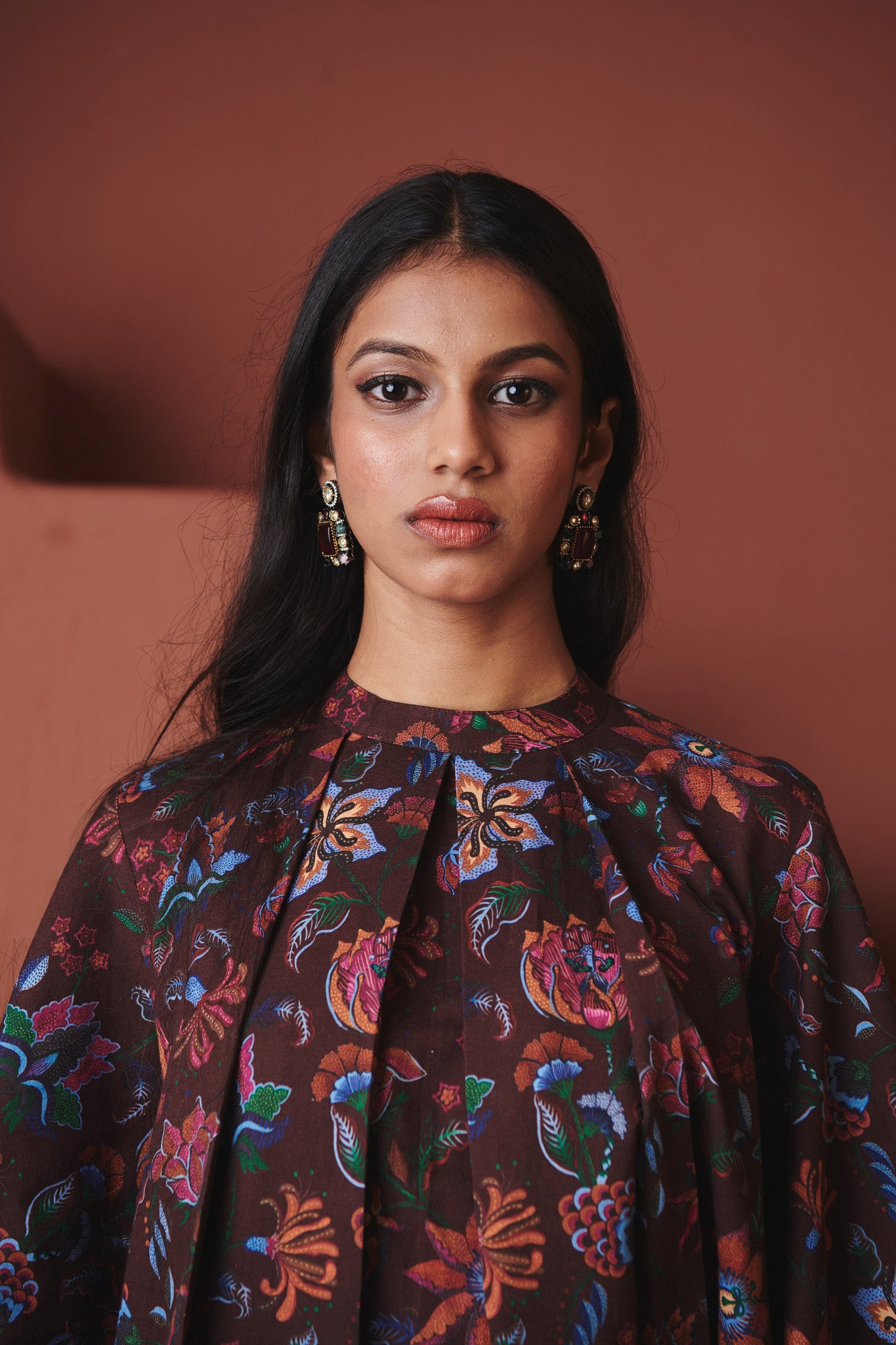 Coffee Chintz Co-Linen Front Pleated Kurta Set