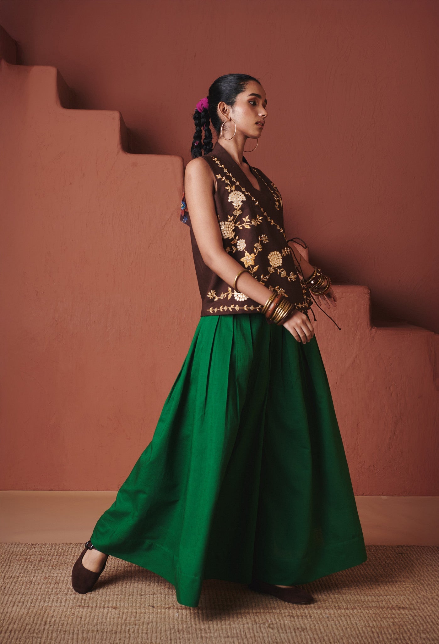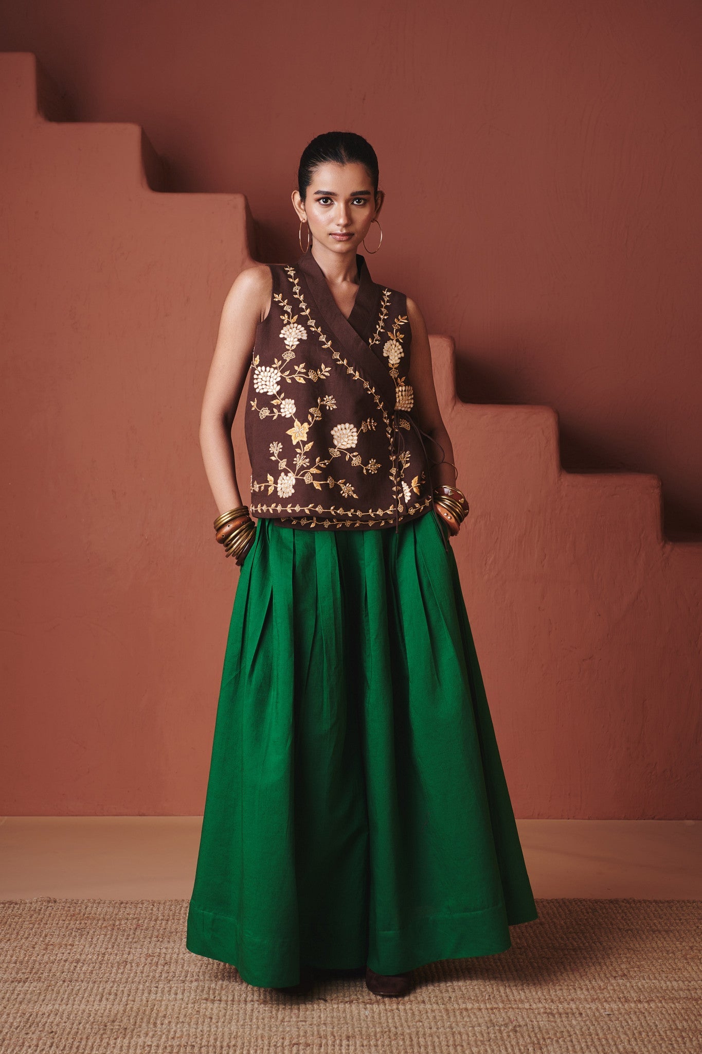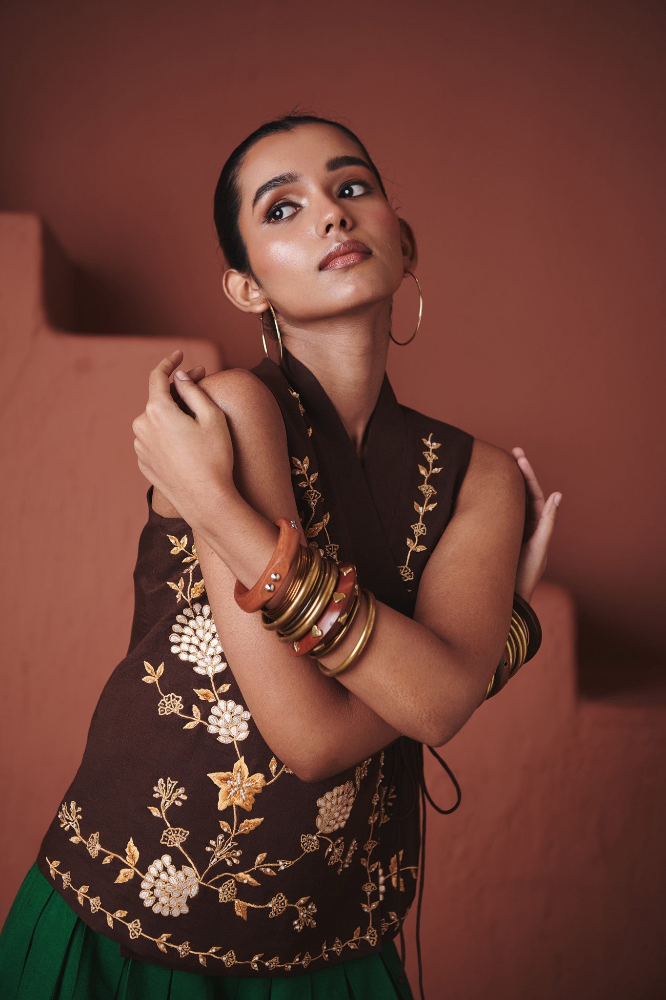 The Coffee Co-Linen Wrap Waistcoat features a flattering cross-front tie closure and exquisite zari floral embroidery. Its intricate hand-finished details make it a versatile layering piece that enhances both festive outfits and everyday linen wear with subtle elegance.