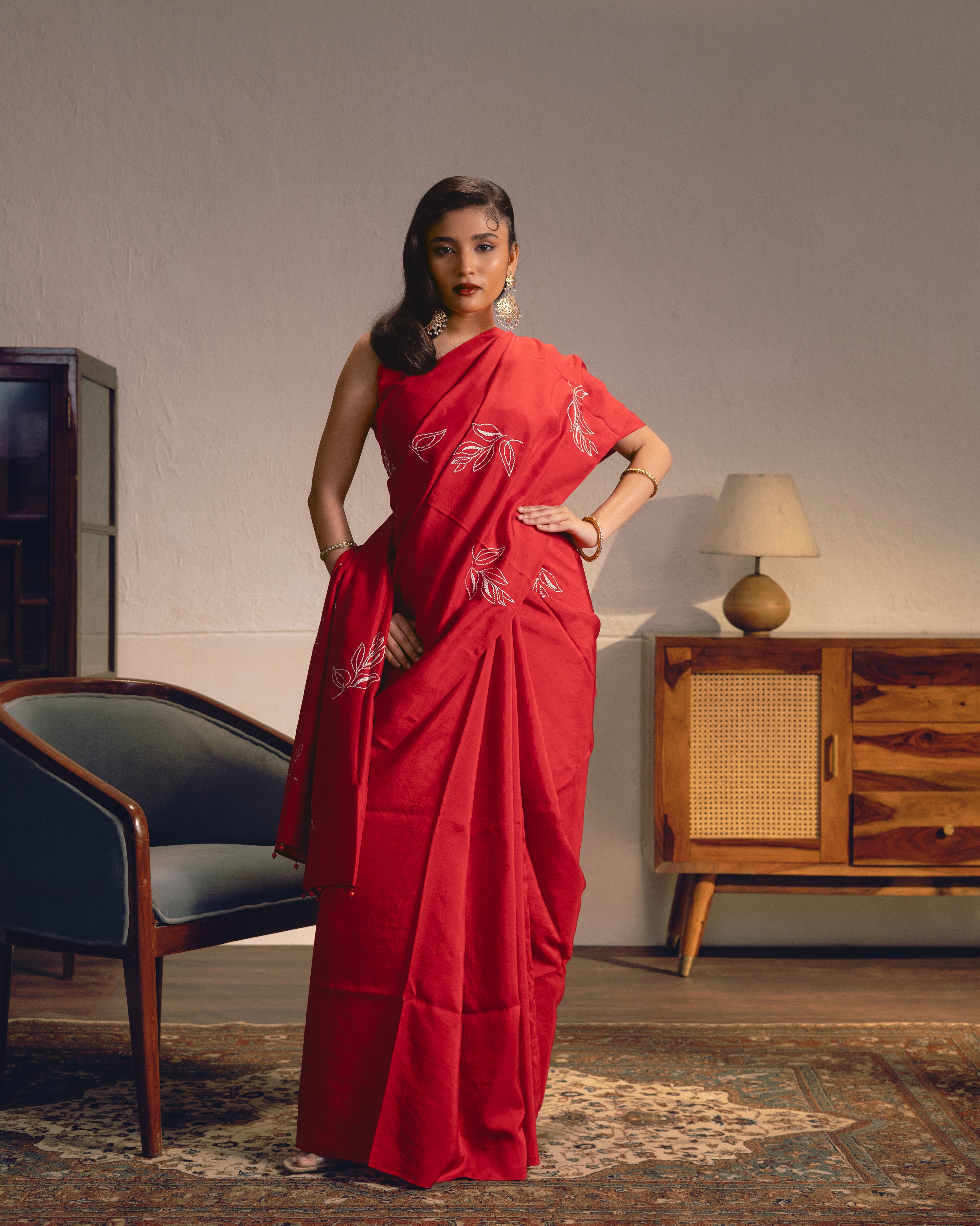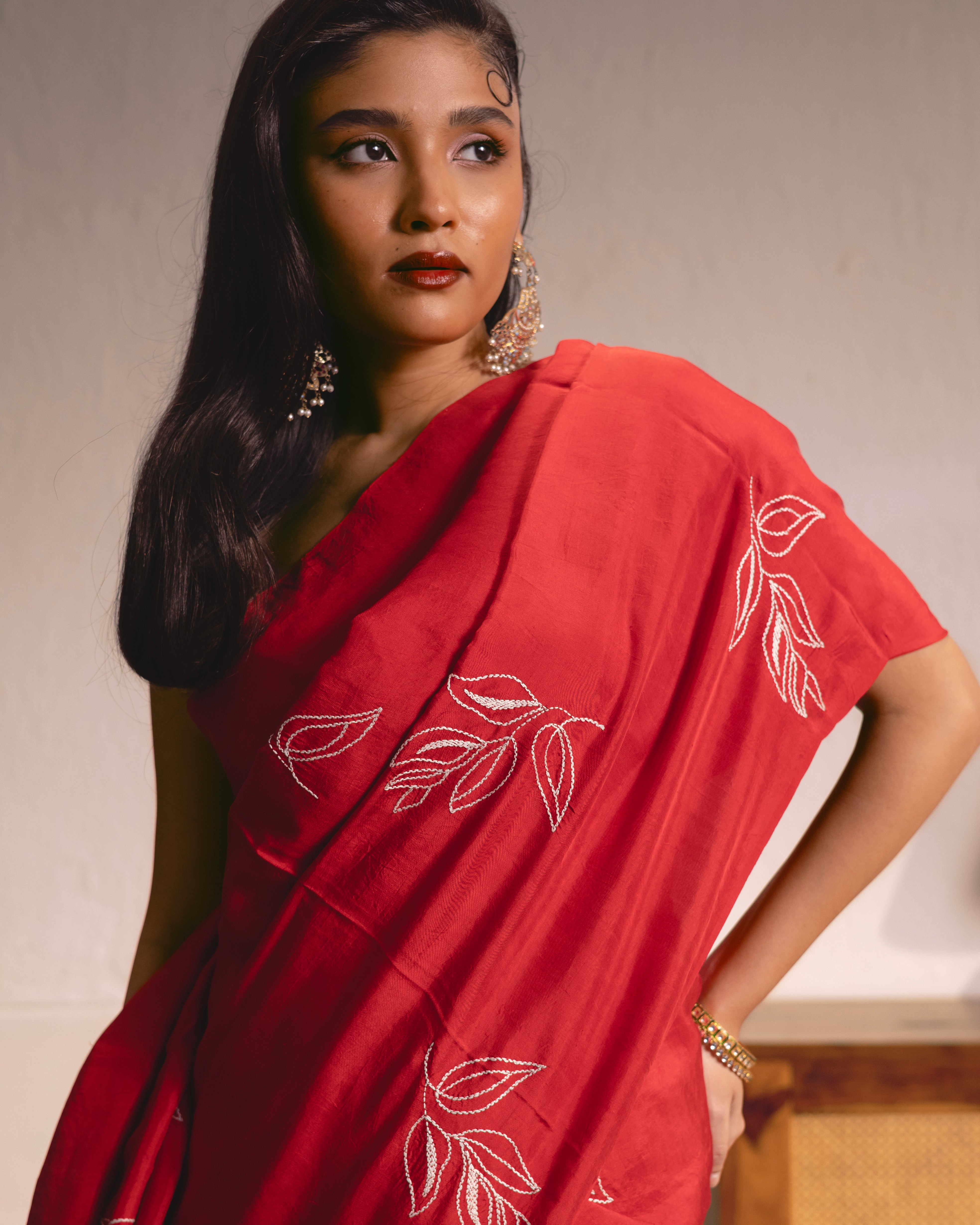 Tarana in red is a bold declaration of elegance, where ivory leaf embroidery dances across luxurious silk with restrained sophistication. The minimal, contemporary design lets the rich crimson speak for itself, a colour that embodies both celebration and depth. This saree is for those who understand that true power lies in understated refinement, where every stitch serves a purpose and beauty needs no excess.
