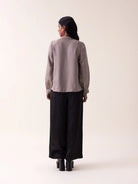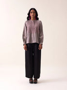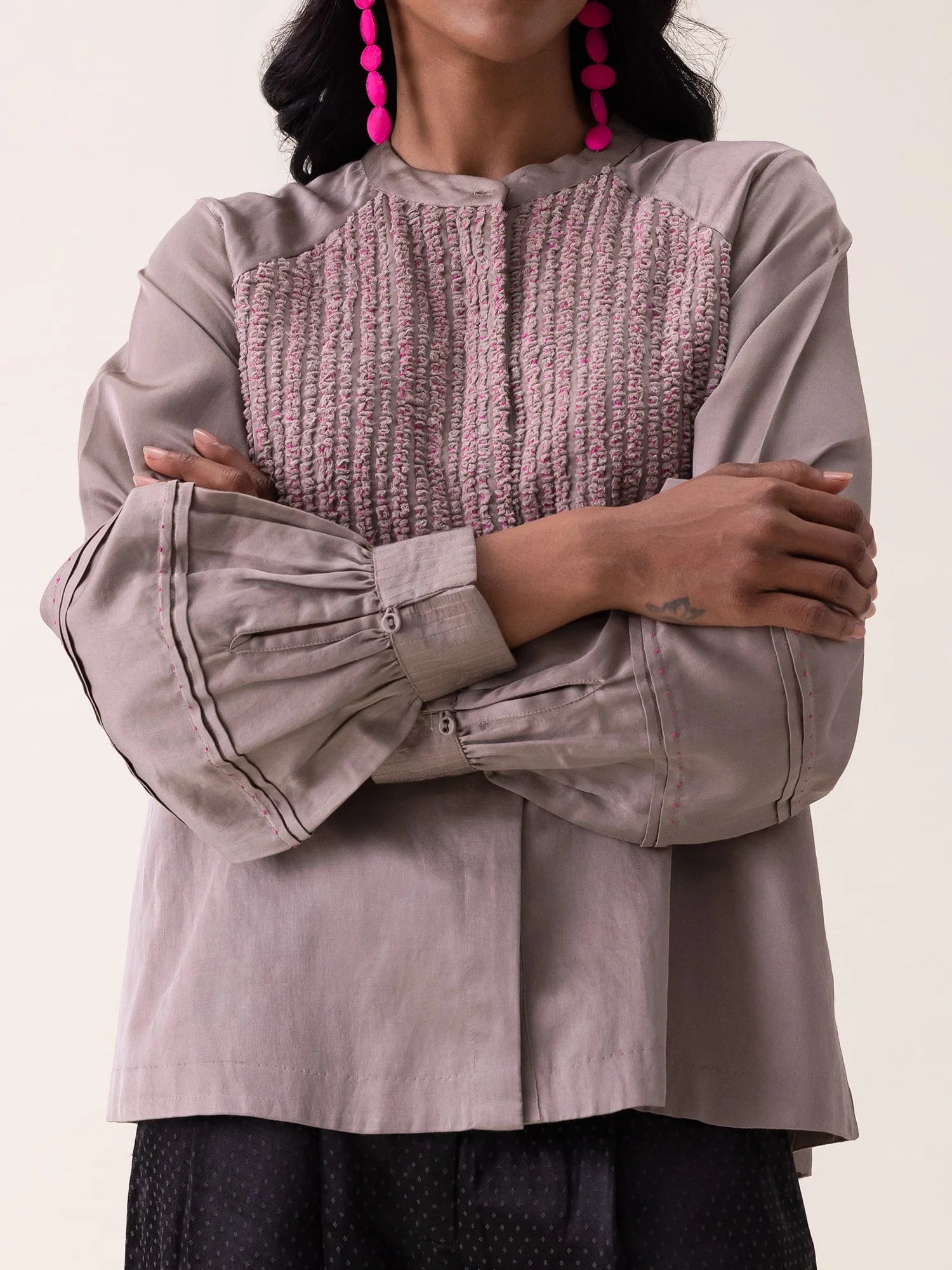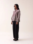 The Cindy Shirt presents a sophisticated take on everyday elegance in a refined grey mashru fabric. Inspired by bamboo textures, this shirt features understated visual interest through carefully placed electric blush thread accents that add a whisper of color without overwhelming the design. Soft, billowing balloon sleeves provide graceful movement and comfort, while the structured mashru weave ensures the silhouette maintains its polished appearance throughout the day. A versatile piece that seamlessly transitions from professional environments to refined leisure, the Cindy Top celebrates the beauty of restraint and intentional detailing.