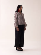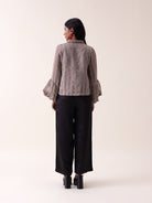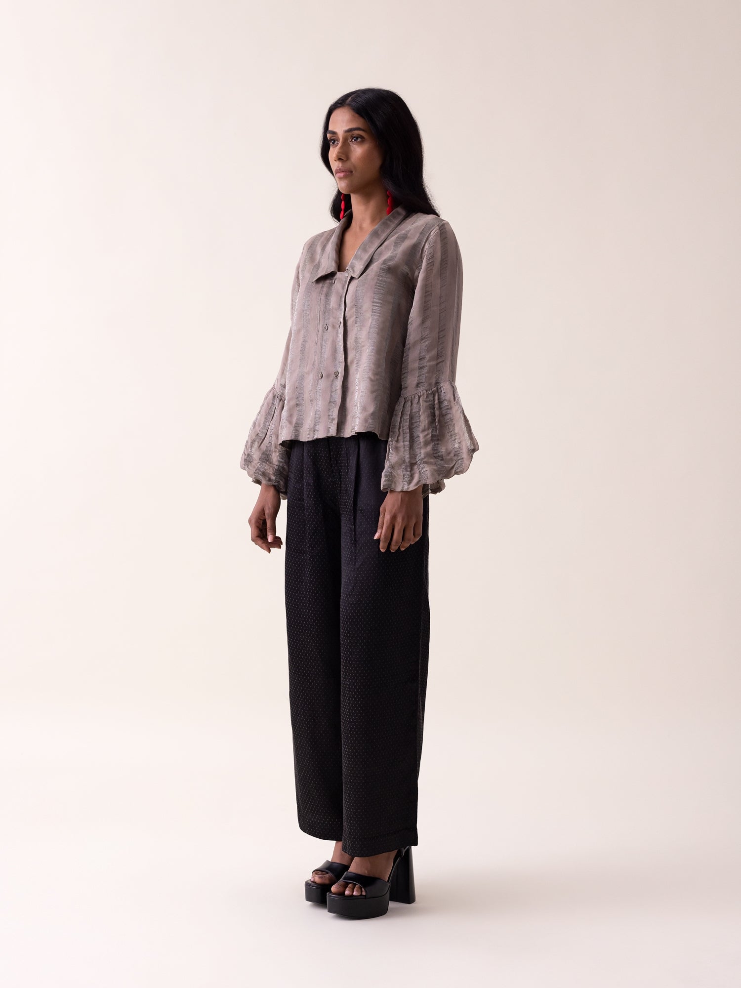 The Darcy Shirt exemplifies understated refinement through its delicate balance of structure and fluidity. Rendered in lightweight tissue fabric with subtle striping, this piece features a tailored double-breasted placket that anchors the design with quiet authority. Graceful balloon sleeves soften the silhouette while maintaining the shirt's composed aesthetic. The sheer, airy texture creates an ethereal quality that belies the garment's polished construction, making it equally at home layered over basics during the day or worn as a standalone statement piece for evening.
