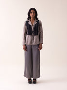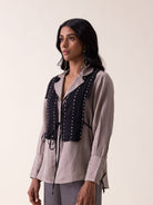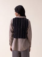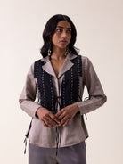 Fio Gilet – Black Elevate your layering with this refined mashru piece, distinguished by intricate kantha embroidery and delicate zari detailing. The adjustable tie-up sides and shoulders offer a customizable silhouette, while soft voile binding provides a polished finish. A versatile essential that bridges traditional craftsmanship with contemporary elegance.
