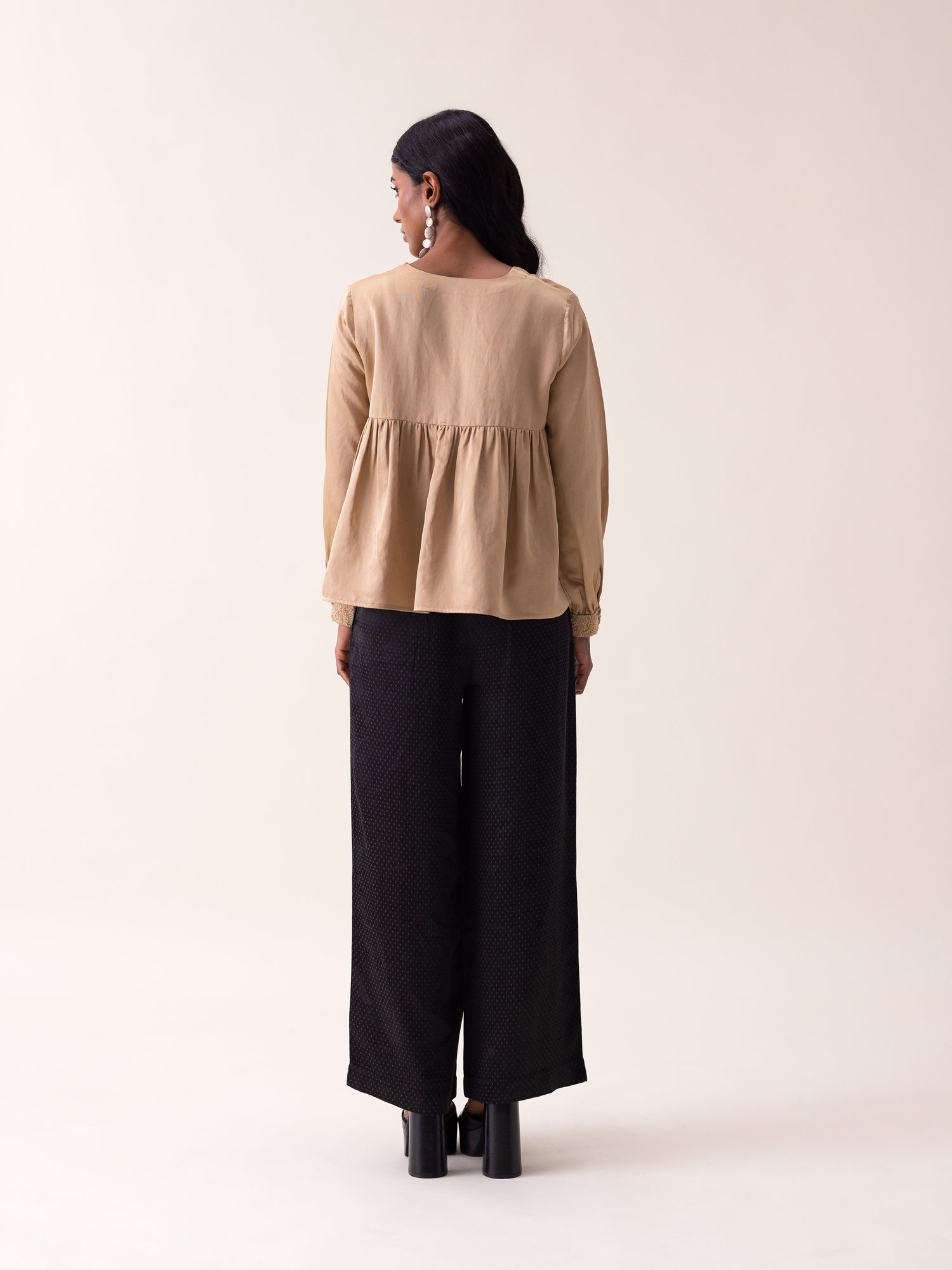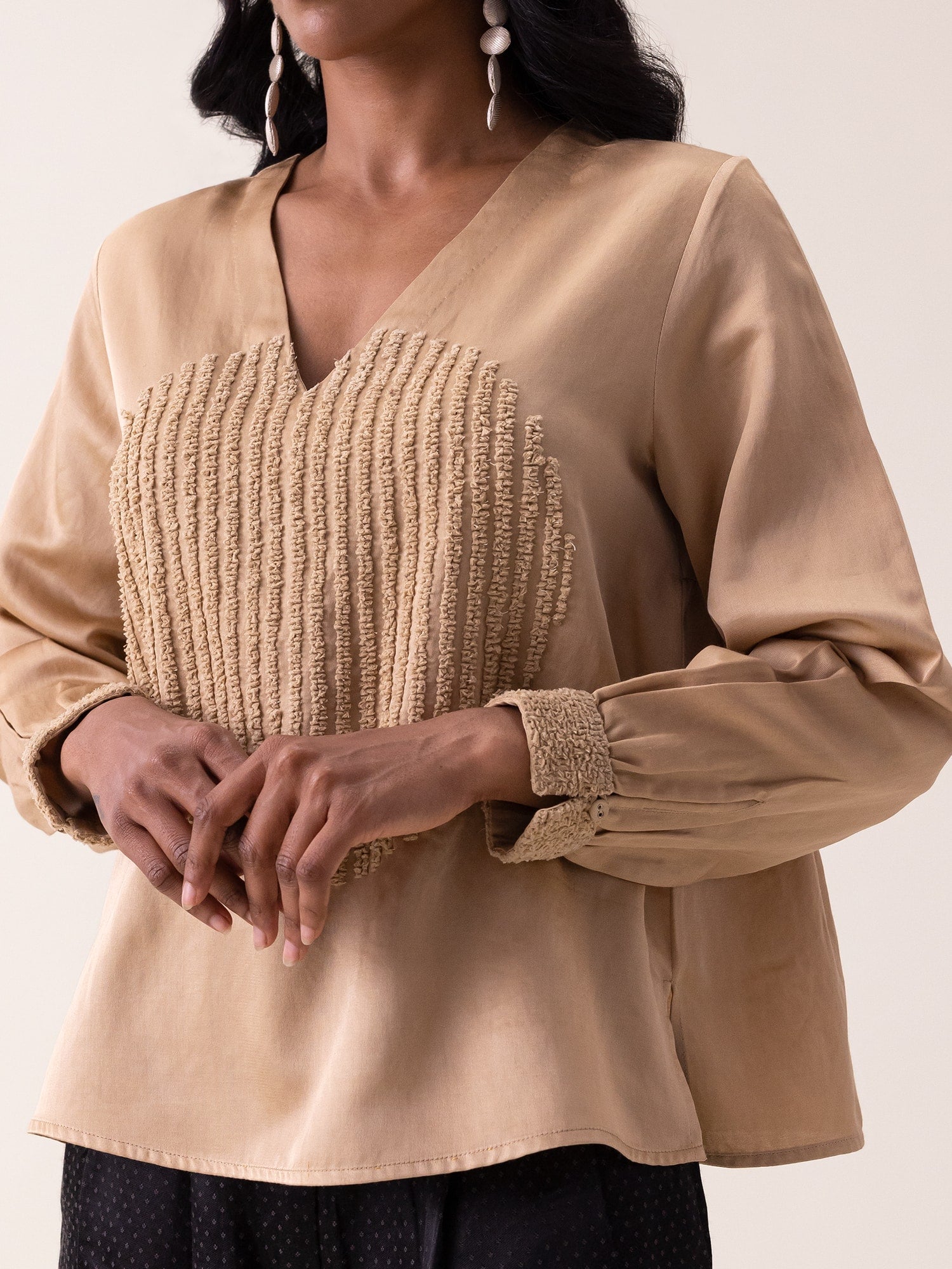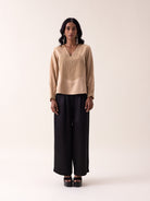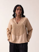 Embrace understated elegance with the Masai Top in warm beige mashru fabric. This sophisticated piece showcases delicate bamboo-textured detailing at the center and cuffs, paired with a refined V-neckline and tonal button closure. The softly gathered back yoke adds graceful dimension, while practical side slits ensure comfortable movement. Perfect for effortless, polished styling.