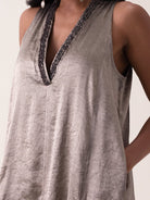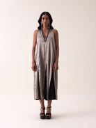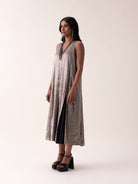 Rue is a refined sleeveless dress that combines contemporary elegance with thoughtful design details. The bamboo-textured V-neckline creates a flattering silhouette, while strategically placed mashru godets provide graceful movement and comfort. A self-finished hemline adds a polished, understated touch. Perfect for those who appreciate minimalist sophistication with functional design.