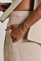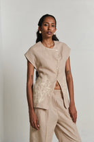 A sleek fit over-lapping top with embroidered sea florals and pleated wide leg pants makes for a comfortable yet dressy set. This is a super versatile set. The silhouette has a classic fit yet experimental, making you stand out in the crowd. Bold yet refined, it’s a staple you’ll reach for again and again.