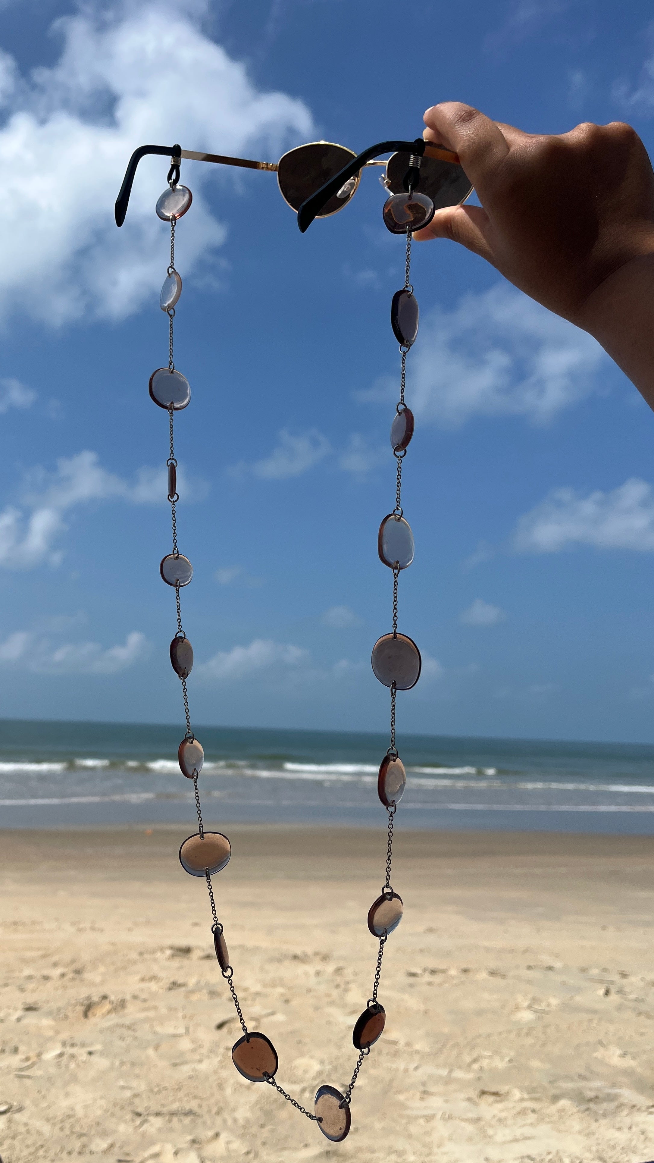 This earthy brown resin sunglass chain combines practicality with understated elegance. The warm, neutral tone pairs effortlessly with any eyewear style and complements a wide range of outfits. Crafted for durability and comfort, it keeps your sunglasses within reach while adding a touch of refined sophistication to your accessories collection.