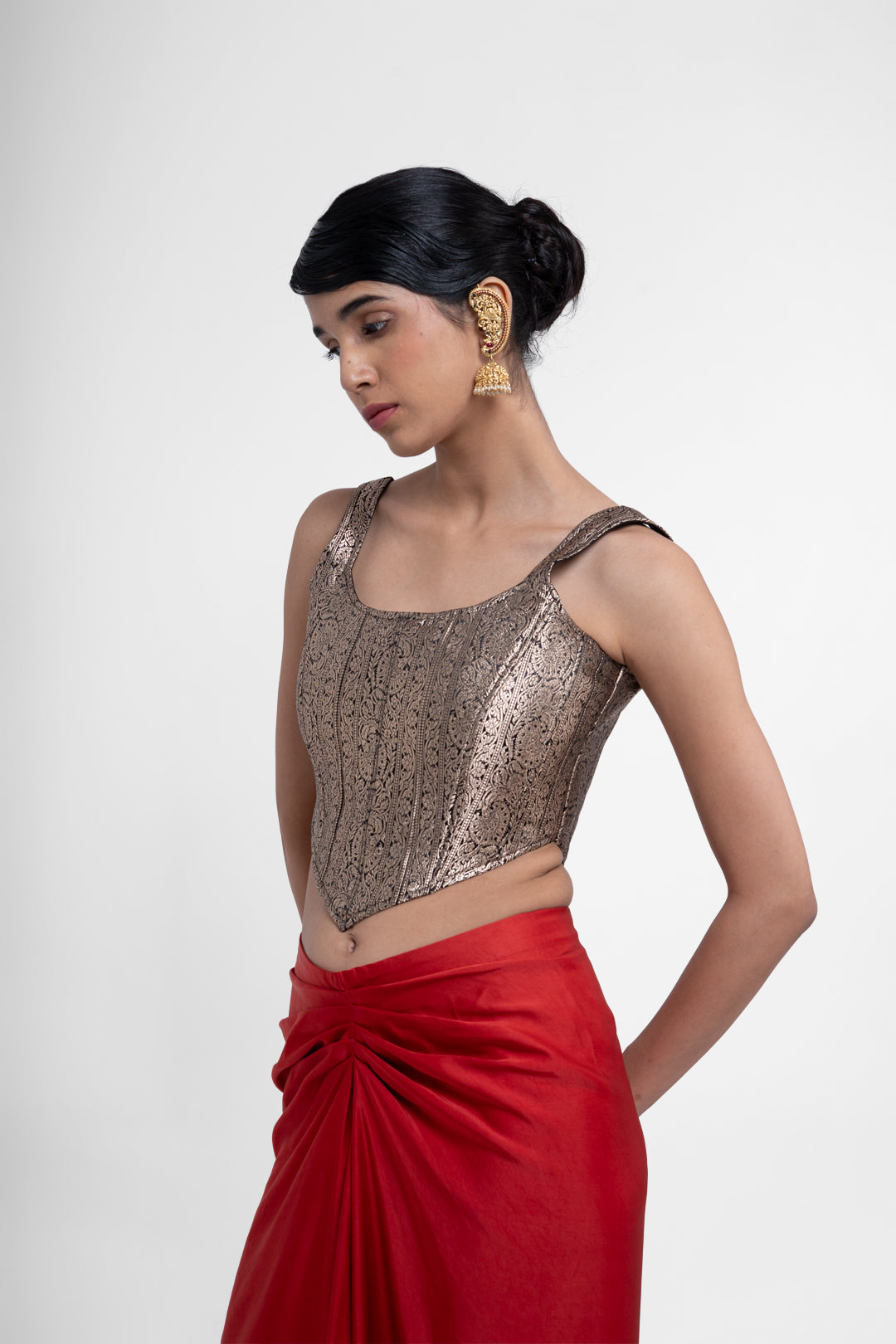 The Anekhi Corset embodies understated luxury in rich Banarasi black weave, adorned with shimmering golden zari accents. Reinforced with structured boning throughout, it delivers a refined silhouette with impeccable support and definition. Finished with a graceful back tie-up closure, this timeless piece seamlessly transitions from evening wear to layered styling, offering both elegance and versatility.