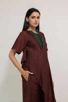 Kurta has round neck, hald sleeves, and asymmetrical hemline
