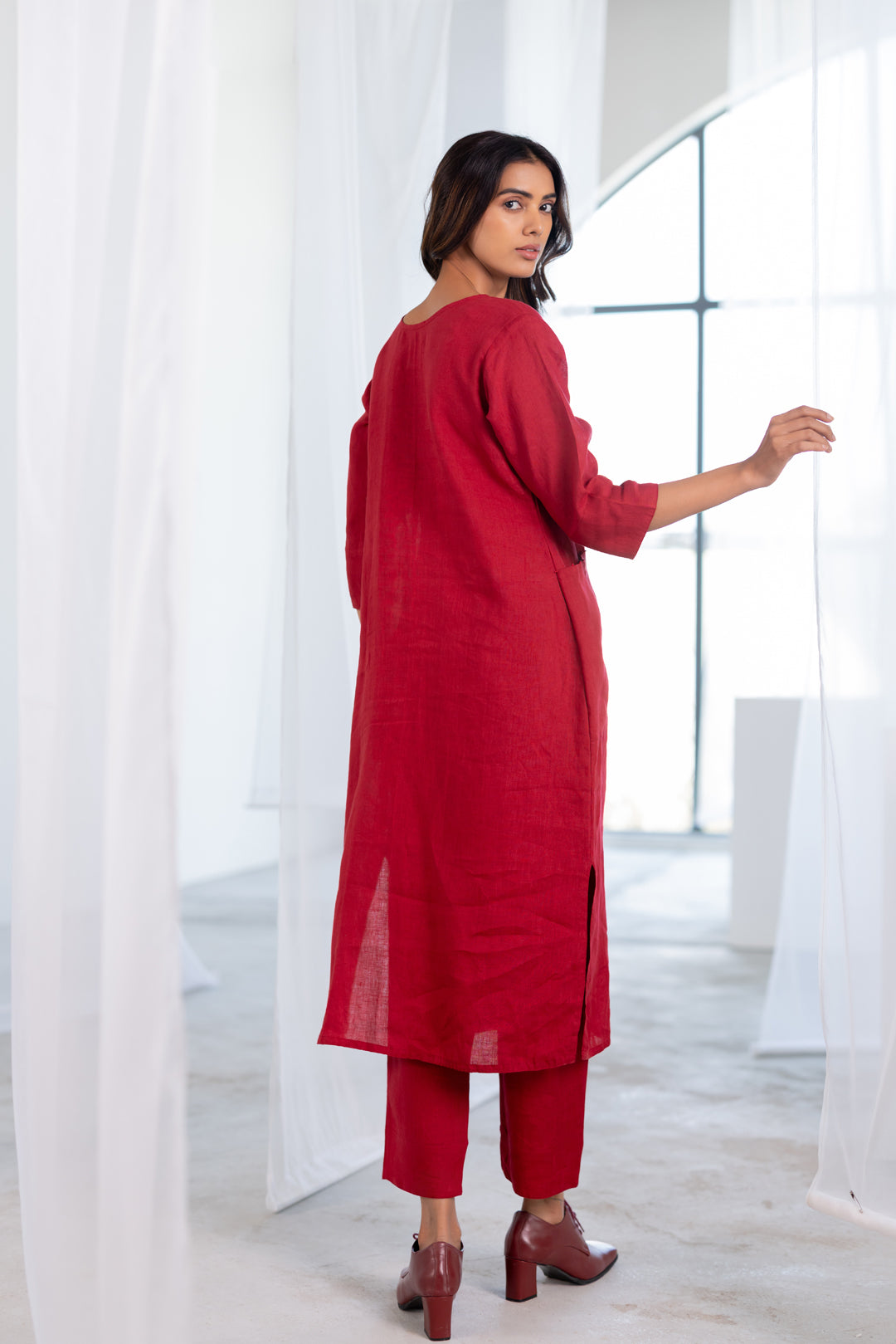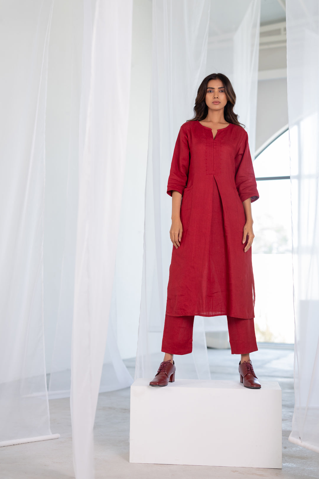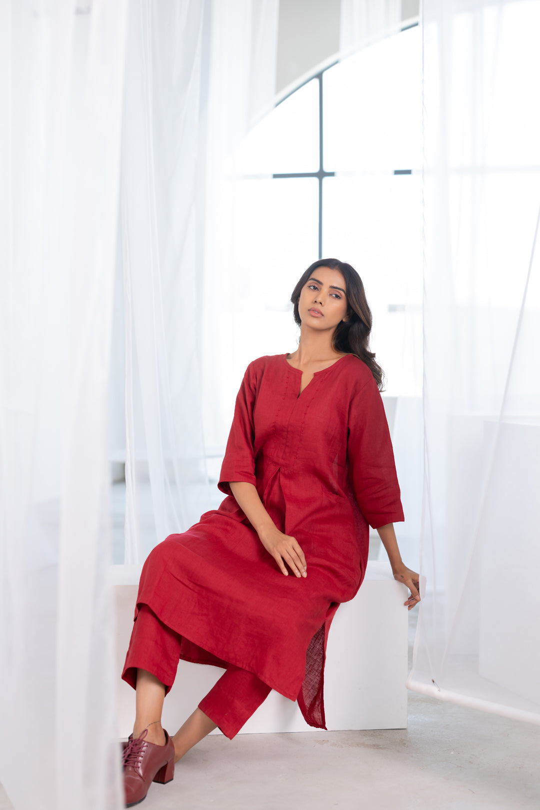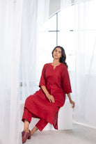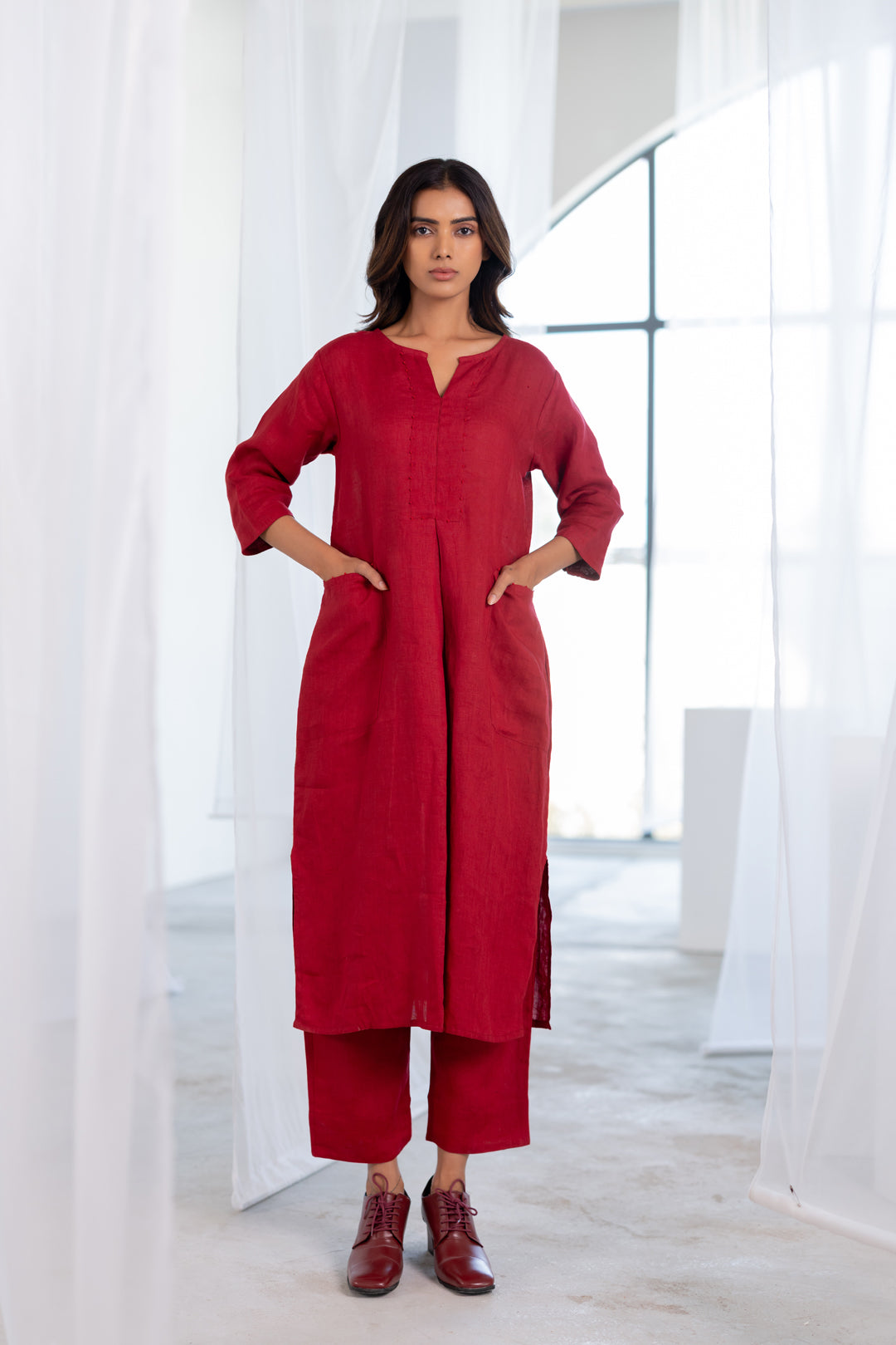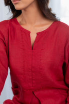 Understated yet refined, this deep red linen co-ord set is designed for effortless everyday elegance. The kurta features a clean round notch-neckline with subtle bead detailing along the neckline, placket, and pocket edges, adding a touch of handcrafted charm. With a relaxed silhouette, three-quarter sleeves, and functional side pockets, it pairs seamlessly with matching linen pants for a polished yet comfortable look.