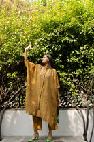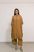 Effortless elegance with its fluid silhouette and rich texture. The set features gold abstract embroidery, adding depth and a subtle shimmer to the luxurious fabric. Designed for both comfort and style, the relaxed kaftan pairs perfectly with coordinated pants.
