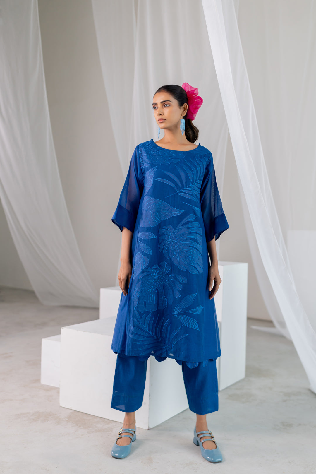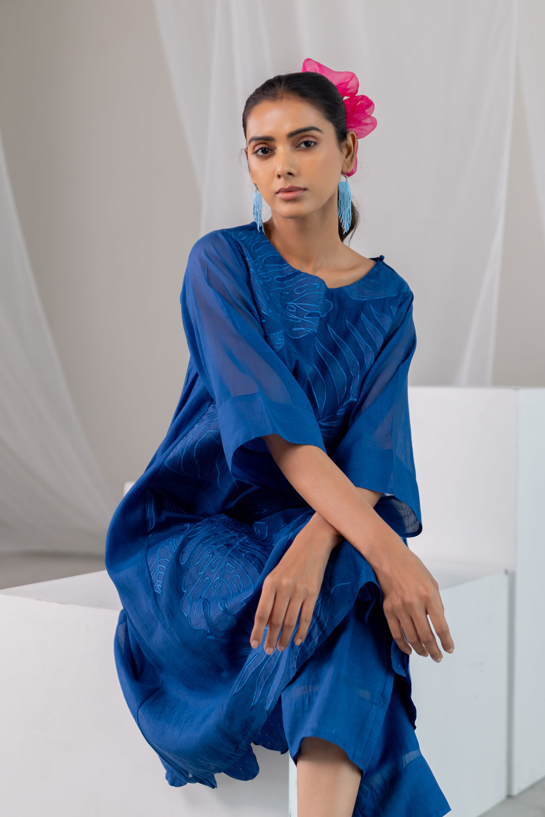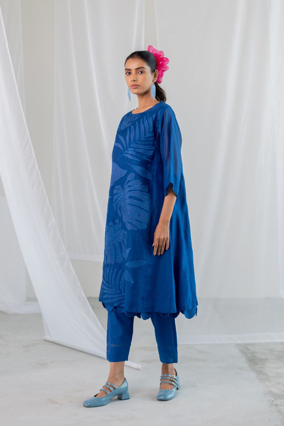 Elegant and lightweight, this blue Chanderi kurta is crafted for effortless summer dressing. It features delicate leaf appliqué detailing along the centre panel, adding a subtle handcrafted charm to the design. Paired with a polka dot scallop slip for added comfort and coverage, this piece balances refined detailing with everyday ease. Designed to be worn as a kurta or styled as a dress, it is ideal for warm days and intimate gatherings.