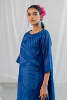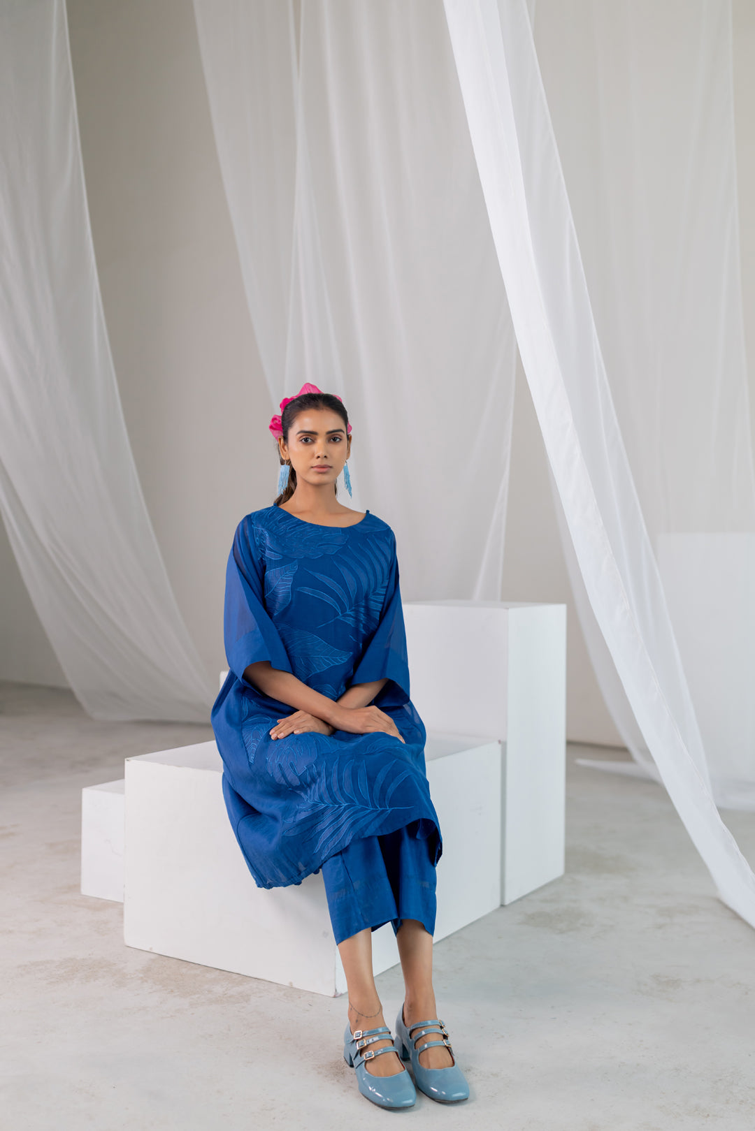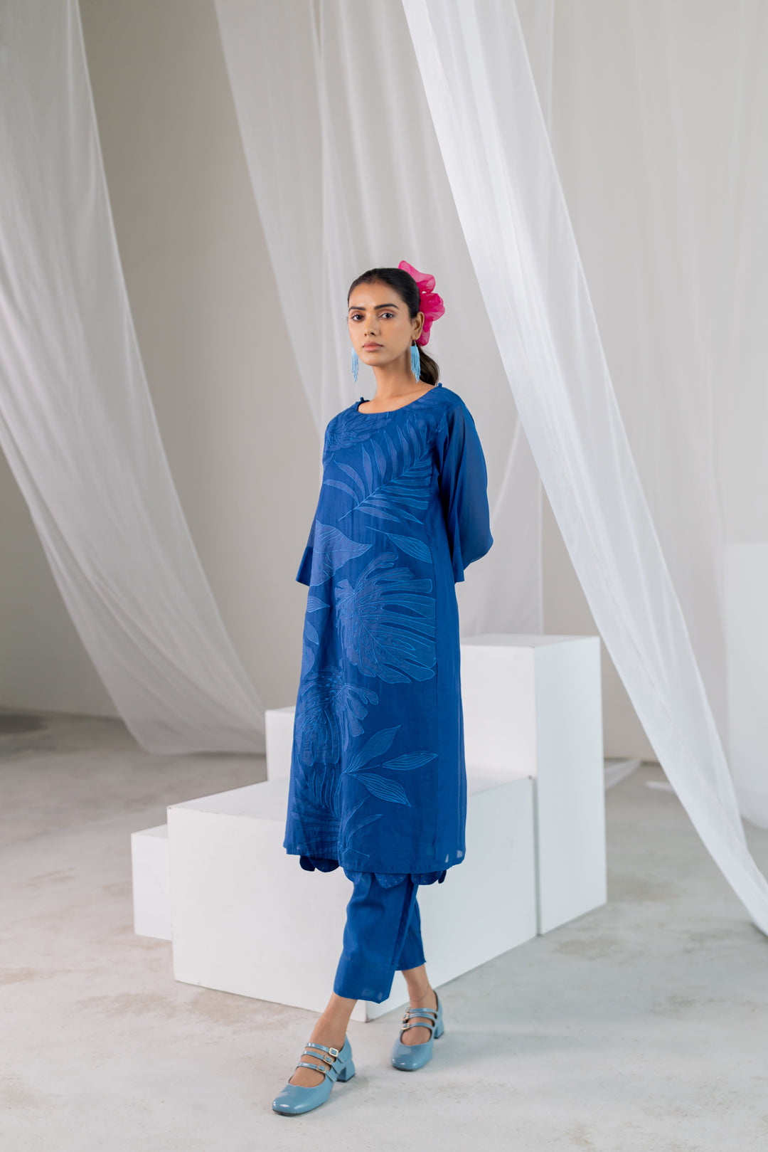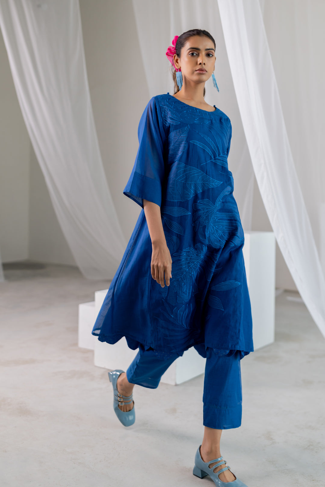 Elegant and lightweight, this blue Chanderi kurta is crafted for effortless summer dressing. It features delicate leaf appliqué detailing along the centre panel, adding a subtle handcrafted charm to the design. Paired with a polka dot scallop slip for added comfort and coverage, this piece balances refined detailing with everyday ease. Designed to be worn as a kurta or styled as a dress, it is ideal for warm days and intimate gatherings.