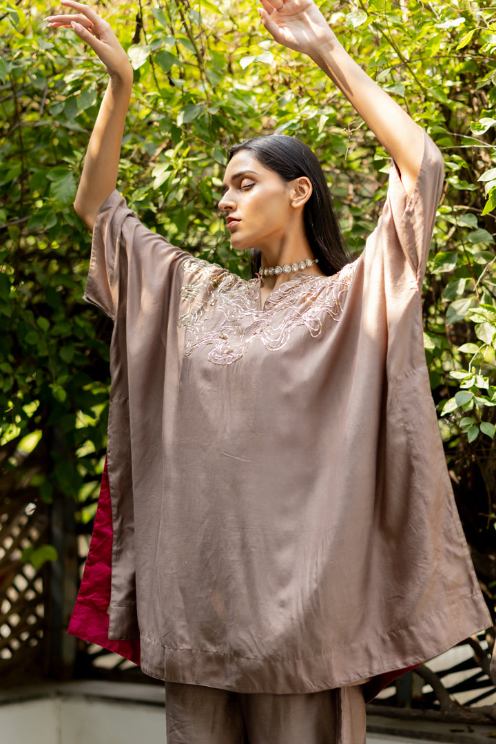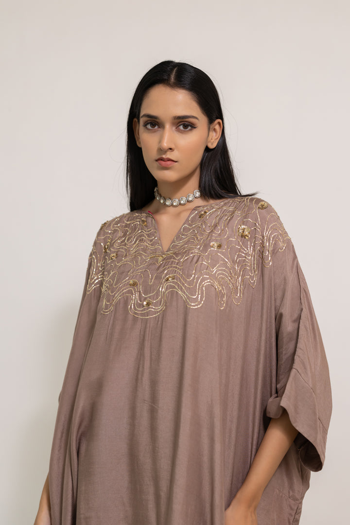 This mouse grey kaftan and pants set offers relaxed elegance with its flowy design and flattering fit. Adorned with subtle gold abstract handwork, it adds a refined shimmer to soft grey fabric. Perfect for festive occasions or stylish daywear.