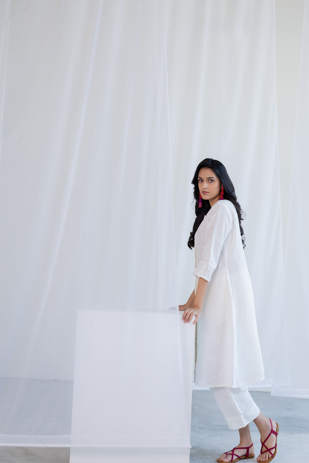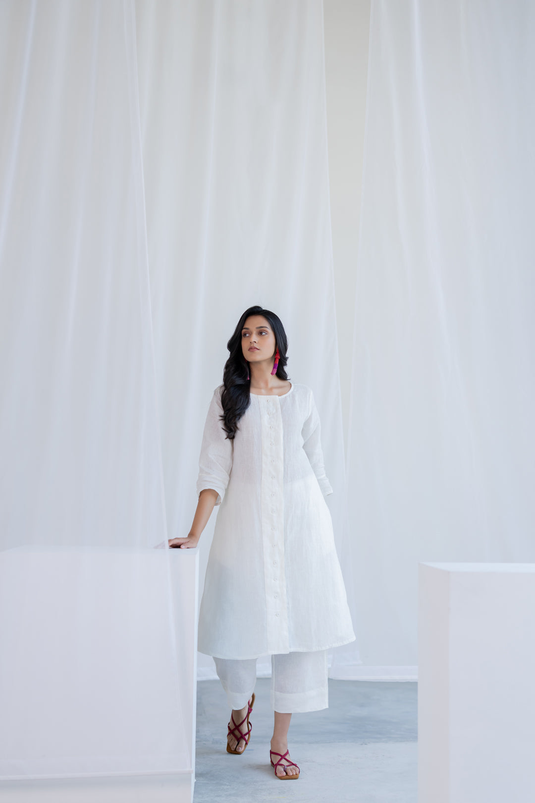 Understated, timeless, and effortlessly refined—this off-white linen co-ord set is a wardrobe essential for elevated everyday dressing. The kurta features a clean round neckline with a front button-down placket that adds a structured, minimal detail to its otherwise fluid silhouette. Crafted in breathable linen, it falls gracefully with a relaxed fit, while three-quarter sleeves enhance its easy, versatile appeal. Paired with straight-fit pants, this set blends comfort with quiet sophistication.