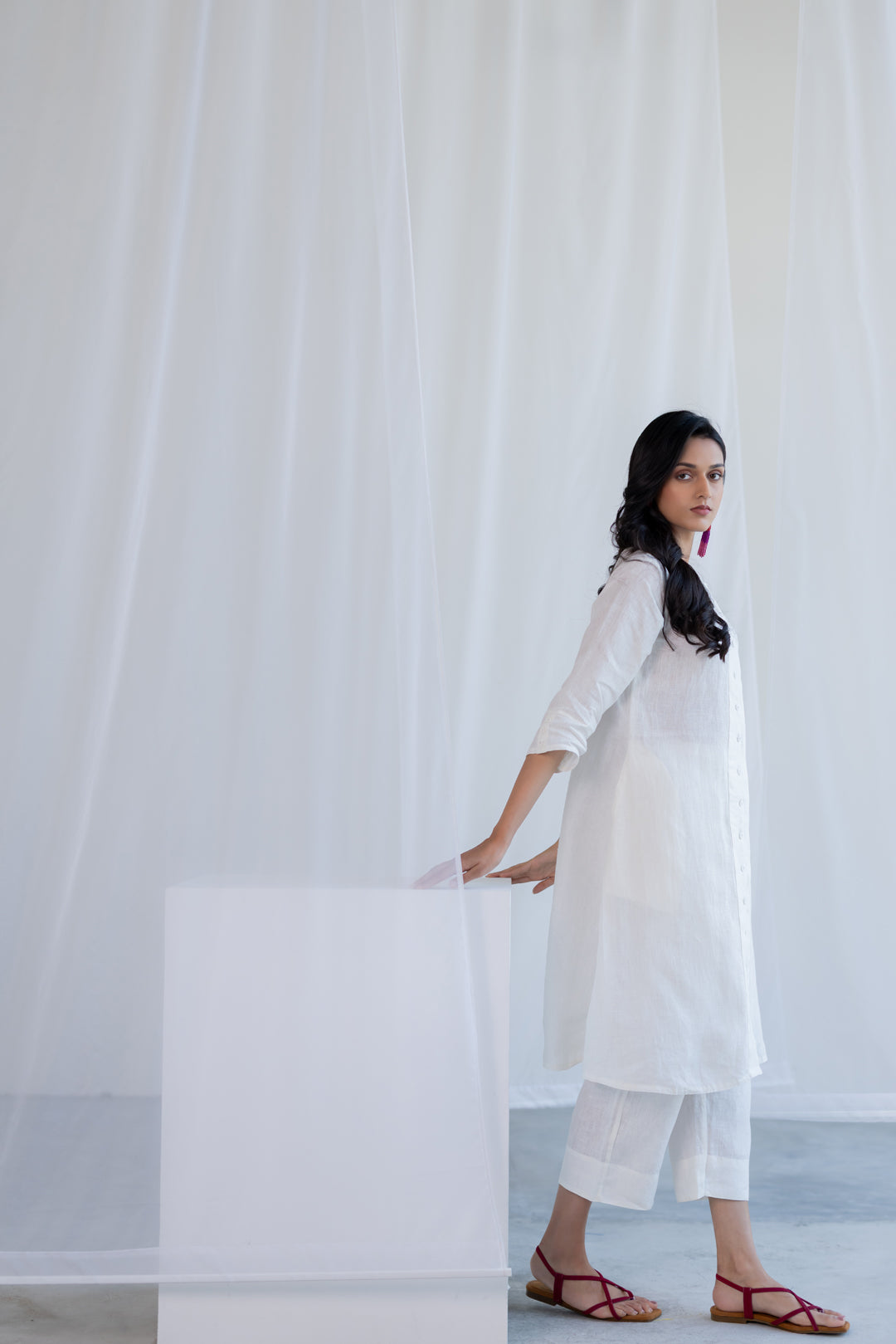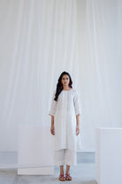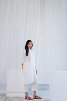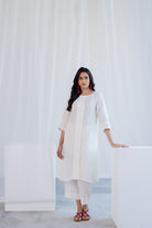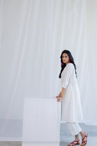 The plain white linen kurta features an elegant button-down placket, adding a subtle yet stylish detail. Its lightweight, breezy fabric allows it to be worn as a dress or layered with pants or leggings, offering multiple styling options for casual, office, or festive looks.