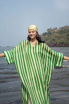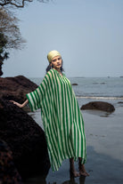 The Angela Kaftan boasts a sumptuous blend of cotton and silk, adorned with a hand-painted striped design. This spacious kaftan features both slits and pockets for added convenience and style.