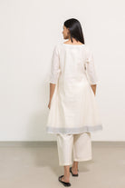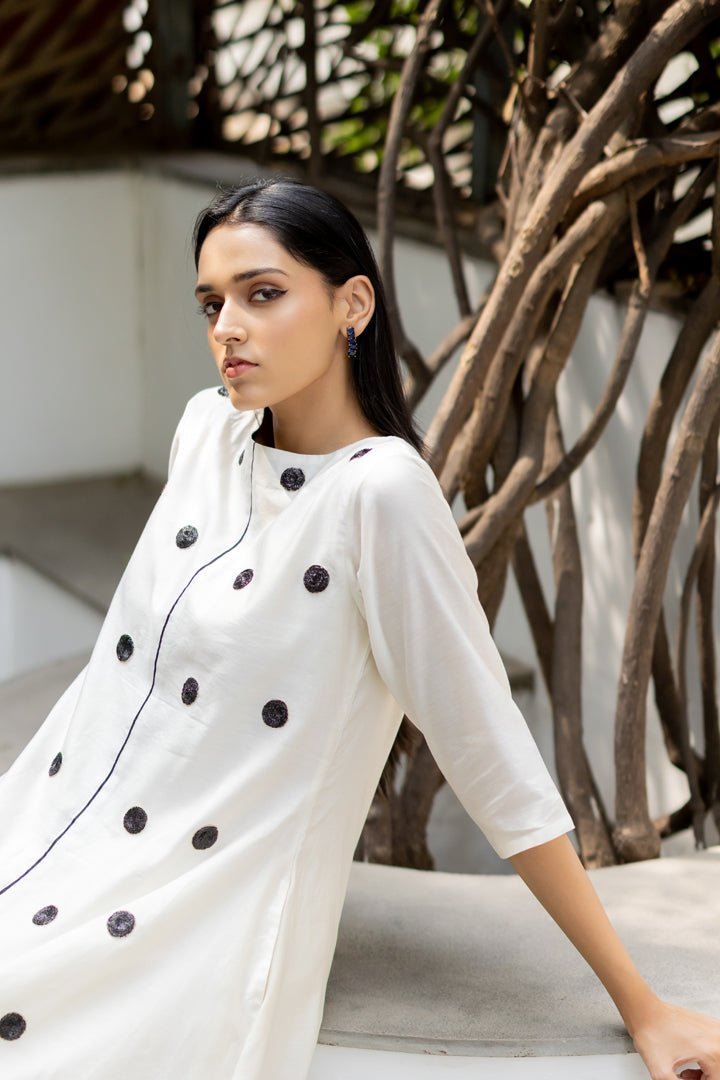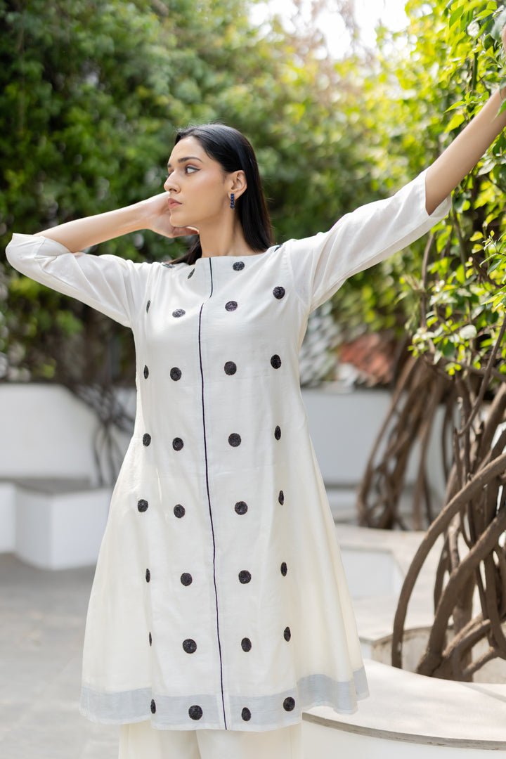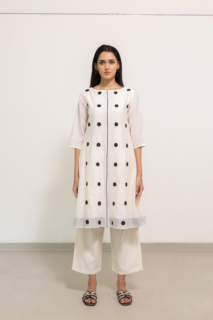Crafted in airy, lightweight Chanderi, the set ensures both comfort and elegance with artisanal detailing. The kurta features a graceful A-line silhouette, enhanced by black handwork dots on the front for a subtle yet striking contrast. Paired with matching straight pants. Kurta and pants are fully lined with cotton mulmul fabric