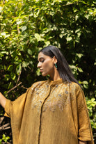 Effortless elegance with its fluid silhouette and rich texture. The set features gold abstract embroidery, adding depth and a subtle shimmer to the luxurious fabric. Designed for both comfort and style, the relaxed kaftan pairs perfectly with coordinated pants.