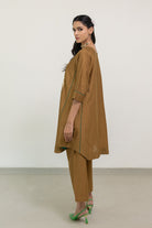 The top is adorned with intricate pitta Zari work in shimmering gold, complemented by contrast green . French knots that add a vibrant touch. Paired with pants, this set effortlessly blends tradition and modernity. Tunic and pants are fully lined with cotton mulmul fabric