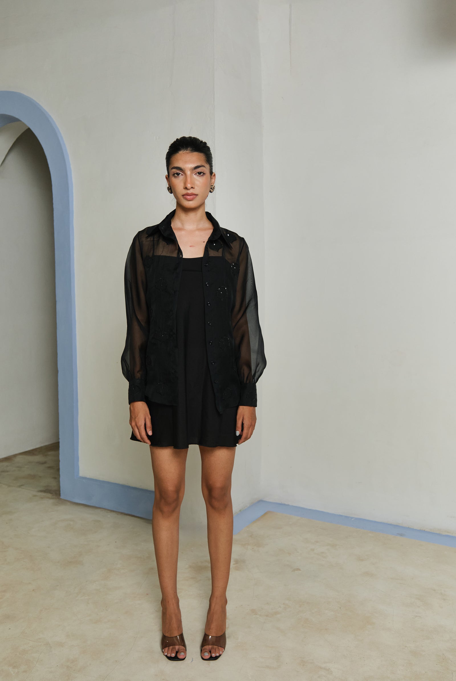 Inspired by beautiful under water creatures, this style is a direct translation of sea weed into a beautiful piece of wearable art. Fine crafted Sea weed organza shirt in black is your perfect breakfast to evening wear. Pair it up with any kind of trousers, skirts or shorts of your choice , you are sure to ace all the looks.