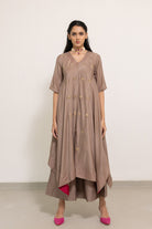 The flowing design is enhanced by metallic golden embroidery on the front, adding a touch of glamour to the muted tone. Asymmetric mouse grey kaftan paired with pants offers a stylish twist on a classic silhouette, balances comfort and elegance effortlessly.