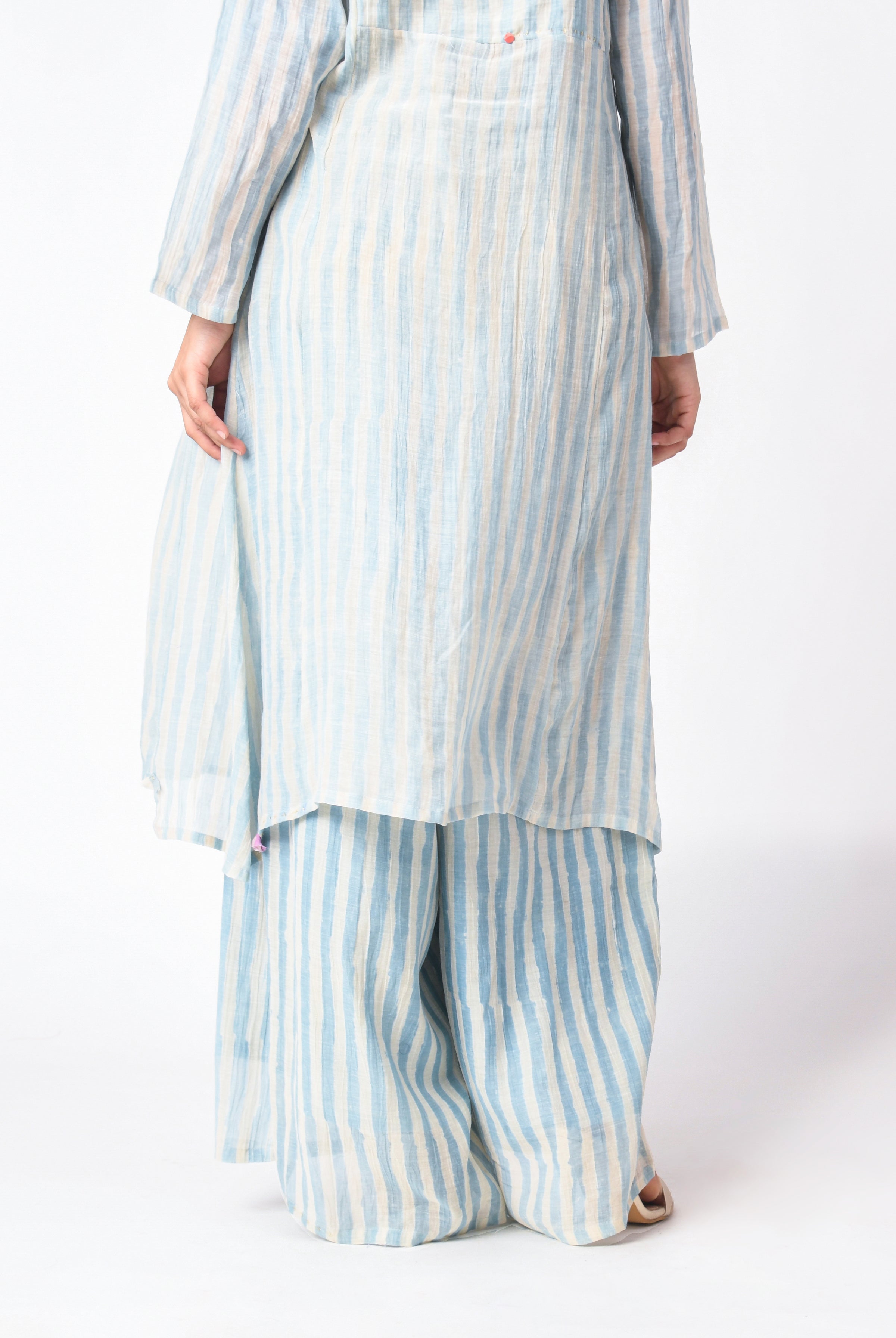 - Pants have semi elasticated waistband, side pockets and side slits with button closure at the hem