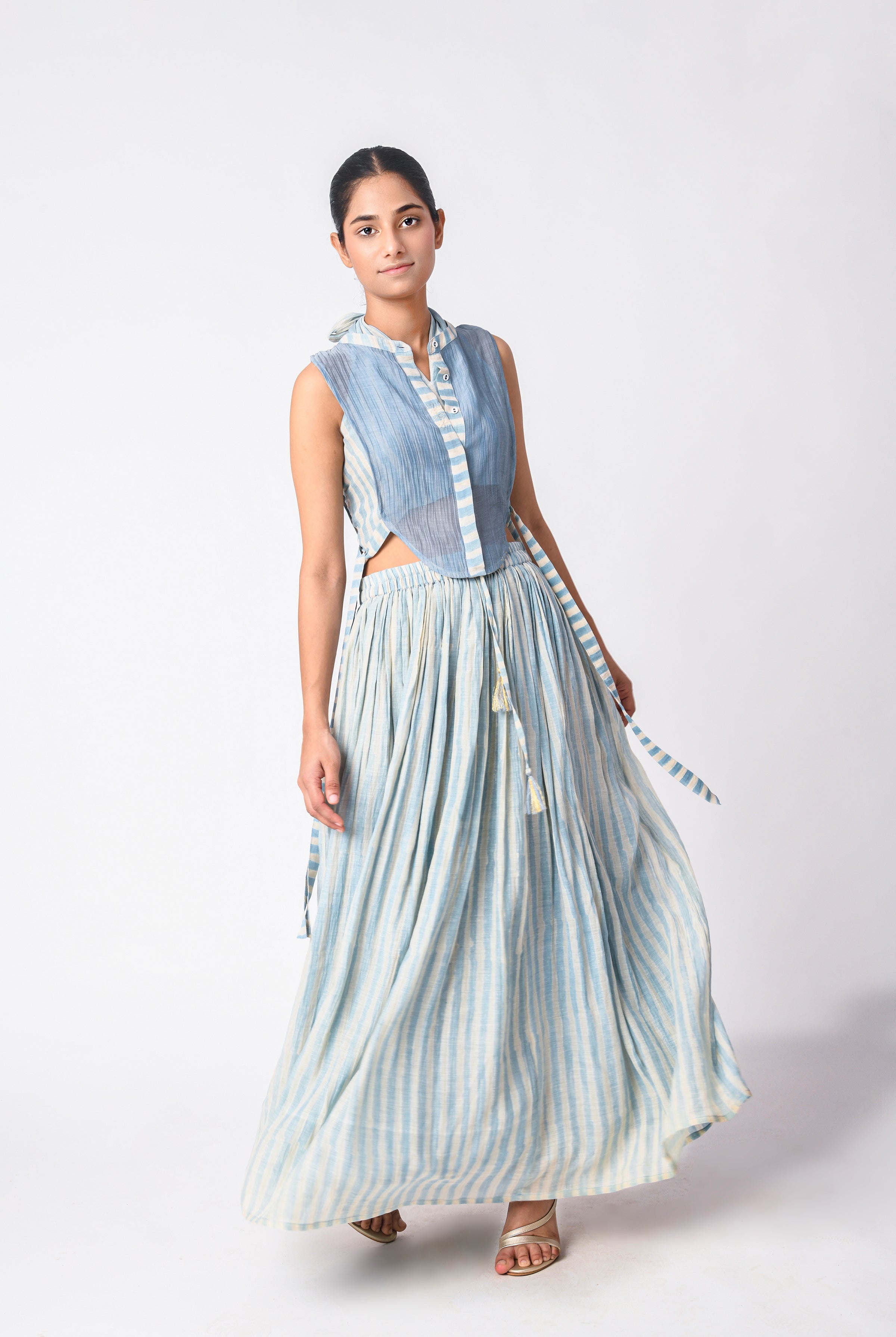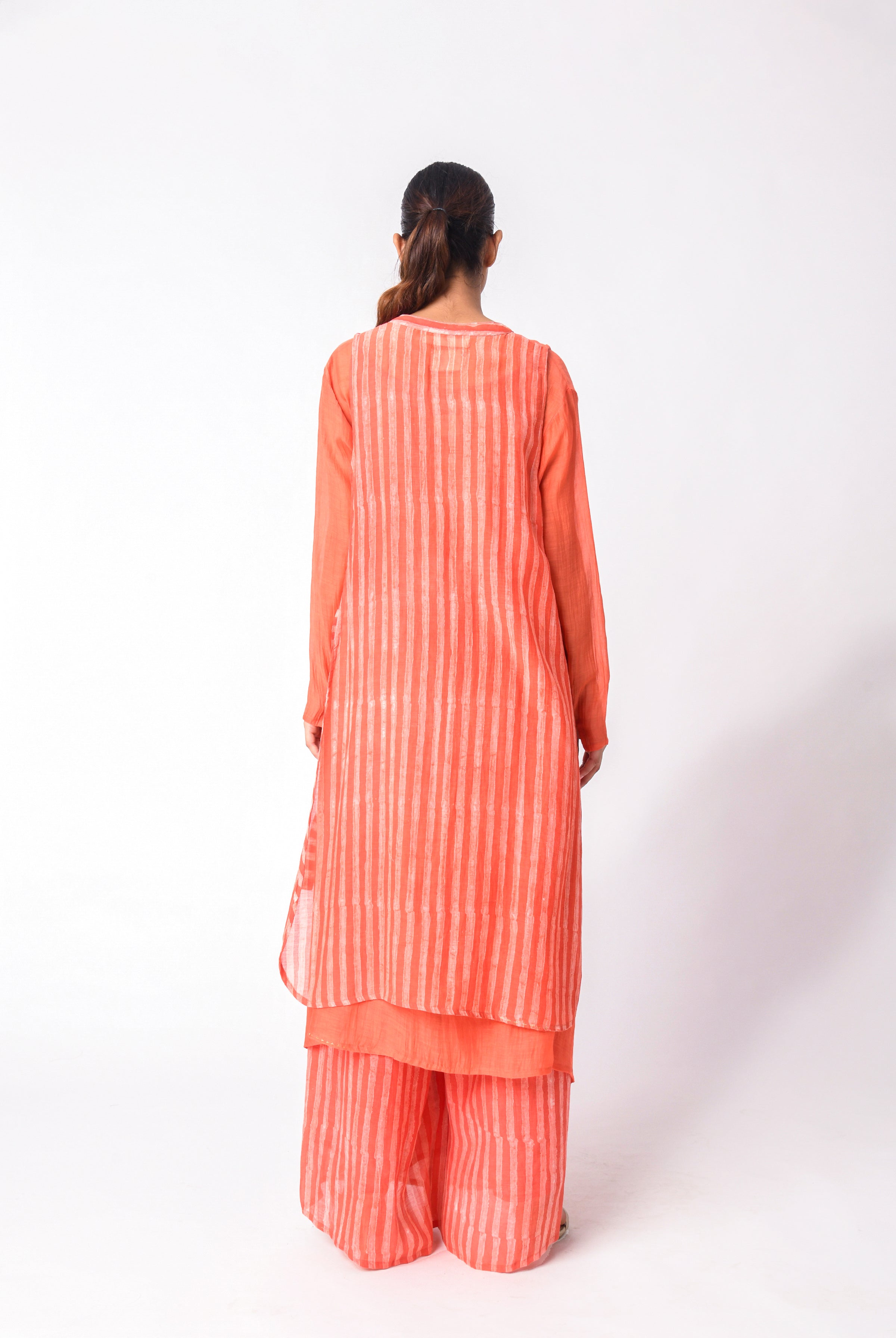 Elevate your ensemble with the Waspie Coral Plum Set, featuring a refined cami wrap elegantly styled with a coordinating bralette. The sophisticated pairing is complemented by fluid elasticated pants, all crafted in exquisite dabu hand-block printed chanderi silk. This artisanal creation marries traditional craftsmanship with contemporary silhouettes for discerning tastes.