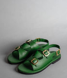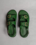 Handcrafted leather sandals that blend comfort with style. Rich green leather, bold gold-tone buckles, and adjustable straps for a perfect fit. Versatile for casual and semi-formal occasions.
