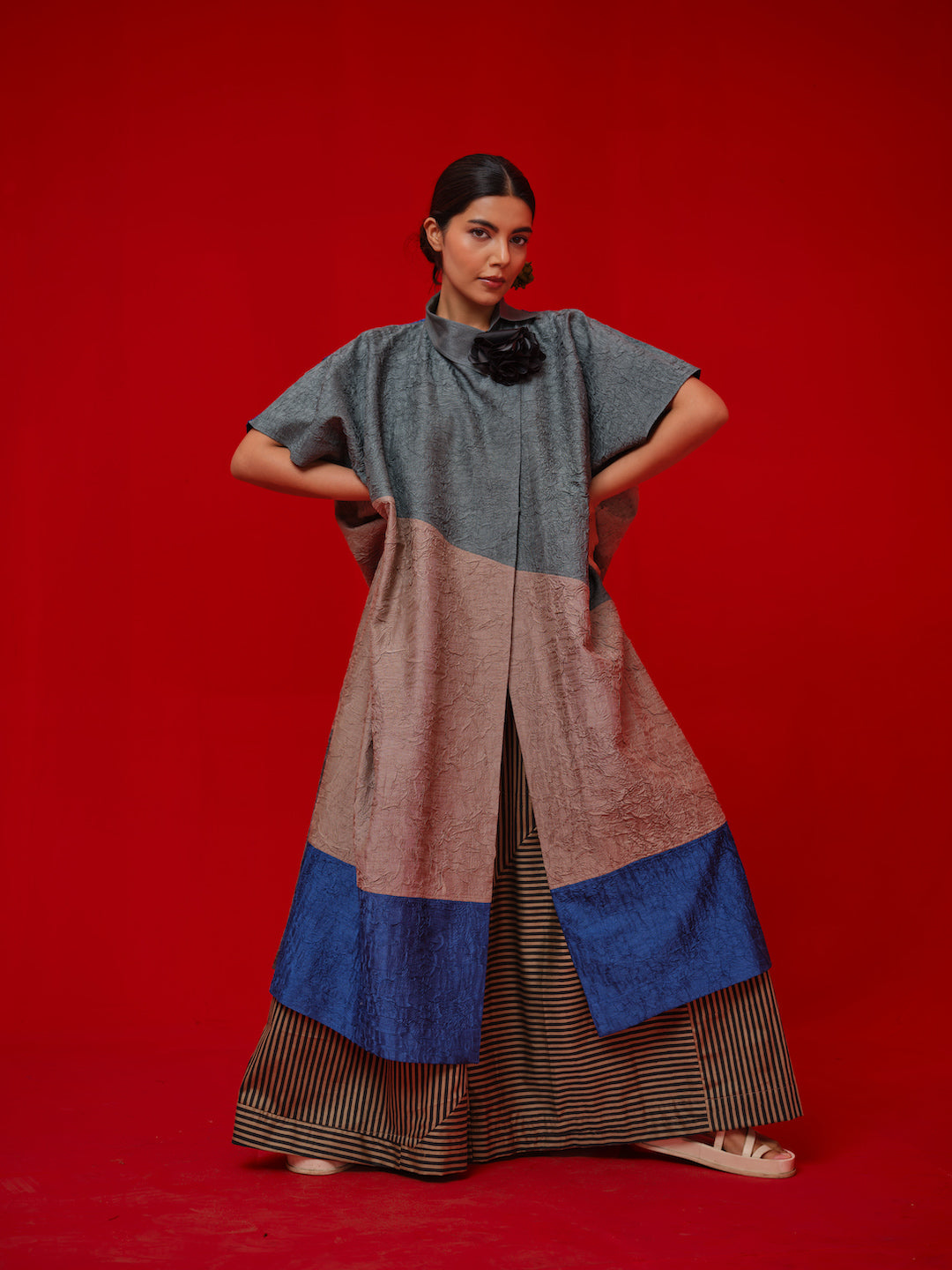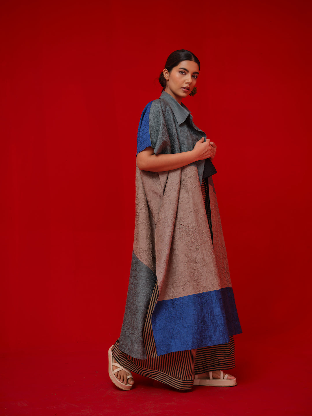 One-size Overlay crafted in hand-crushed fabric, crushed in-house. Designed with an asymmetrical collar and bold color-blocking details for a modern look.