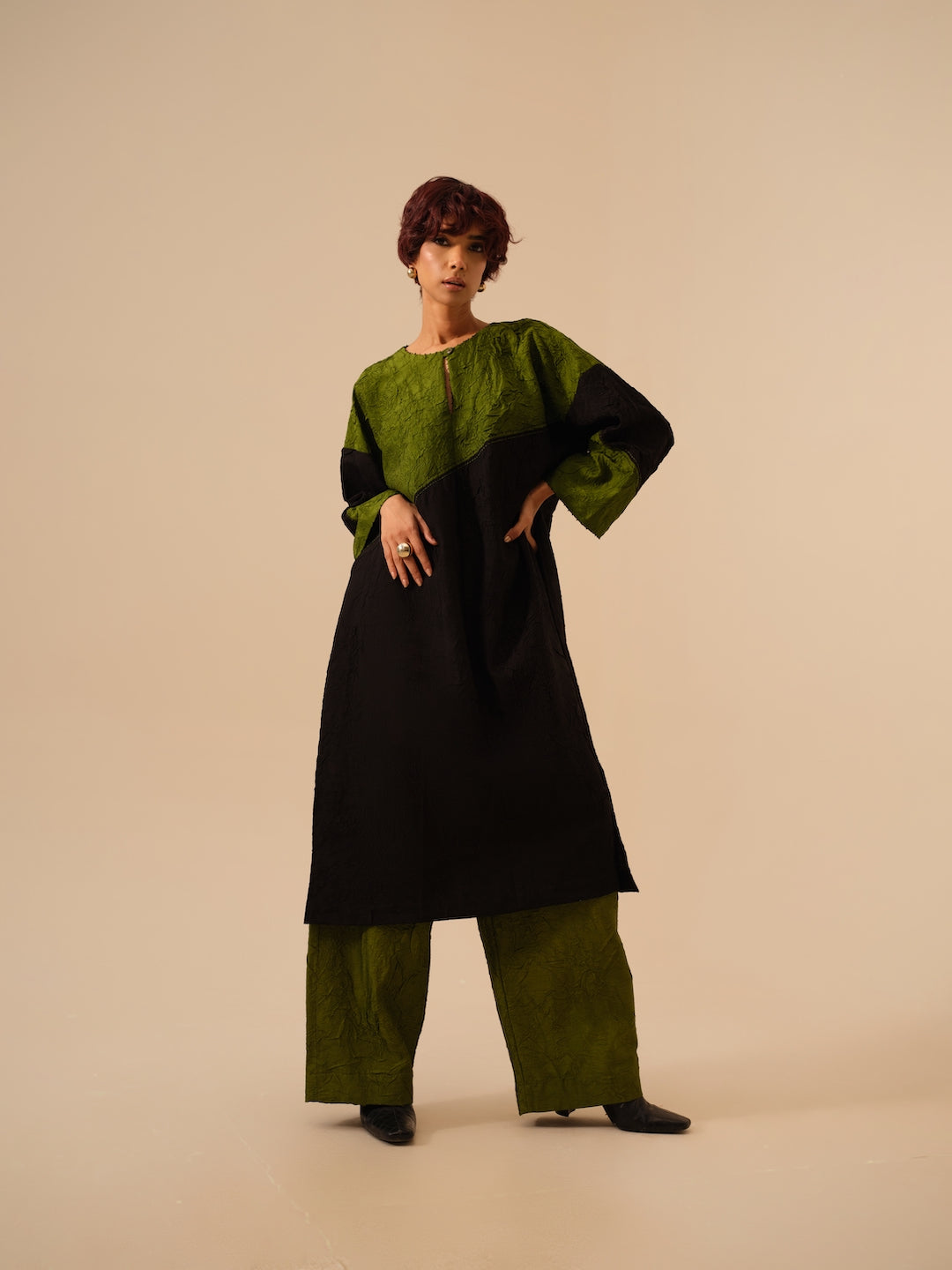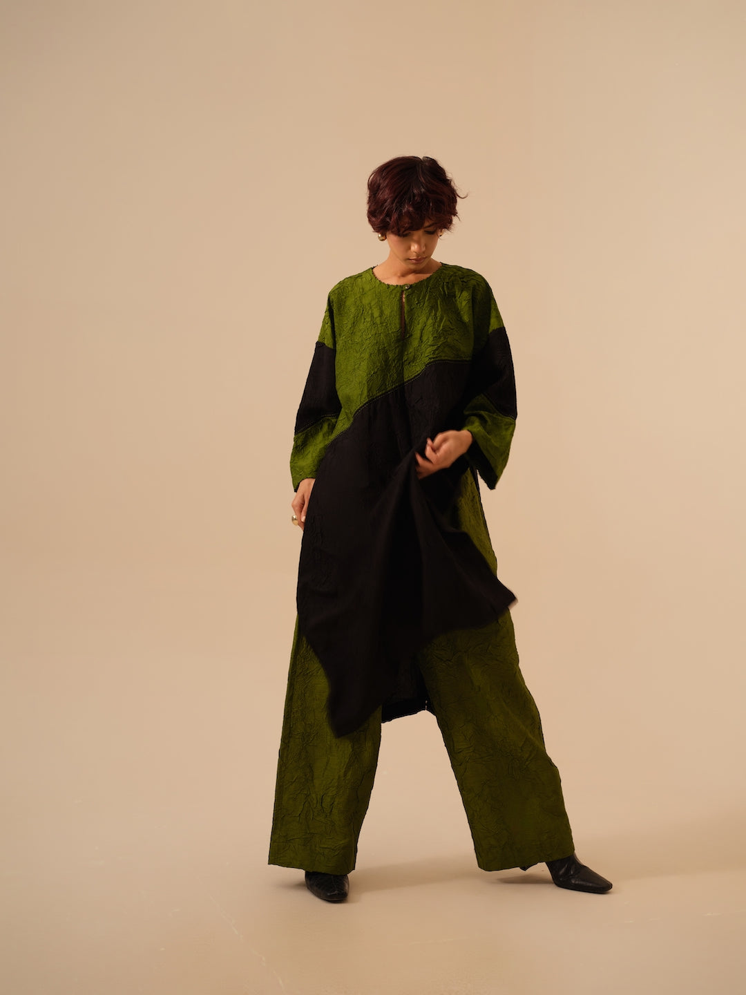 An oversized tunic crafted in hand-crushed silk, designed for ease and movement. The piece features bold color blocking and fine Kantha stitches that trace its surface, celebrating craft through subtle texture and contrast. Effortless yet elevated, it embodies Stoïque’s signature balance of comfort and artistry.