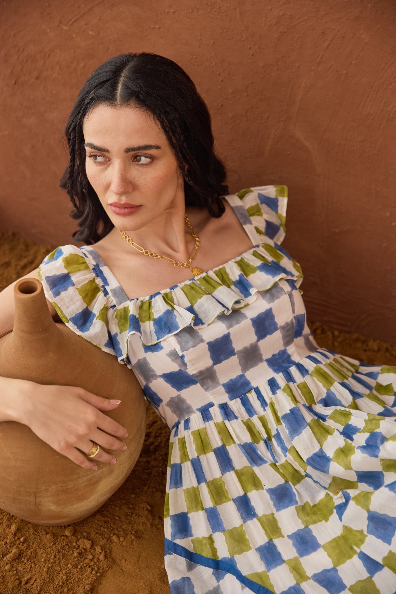Crafted from lightweight, breathable cotton mulmul fabric, the Sky Sketch Dress offers a refined balance of comfort and elegance. Its square scoop neck, highlighted by a contrasting short frill, adds a sophisticated detail that enhances the neckline gracefully. The flowy A-line skirt, designed with gently curving panels, introduces subtle contrast and movement, while the side zip closure ensures a seamless fit. Featuring delicate soft gingham checks, this dress reflects an artisanal charm that captures the subtle textures and tranquility of nature’s canvas, making it an ideal choice for those who appreciate understated, natural elegance in their wardrobe.
