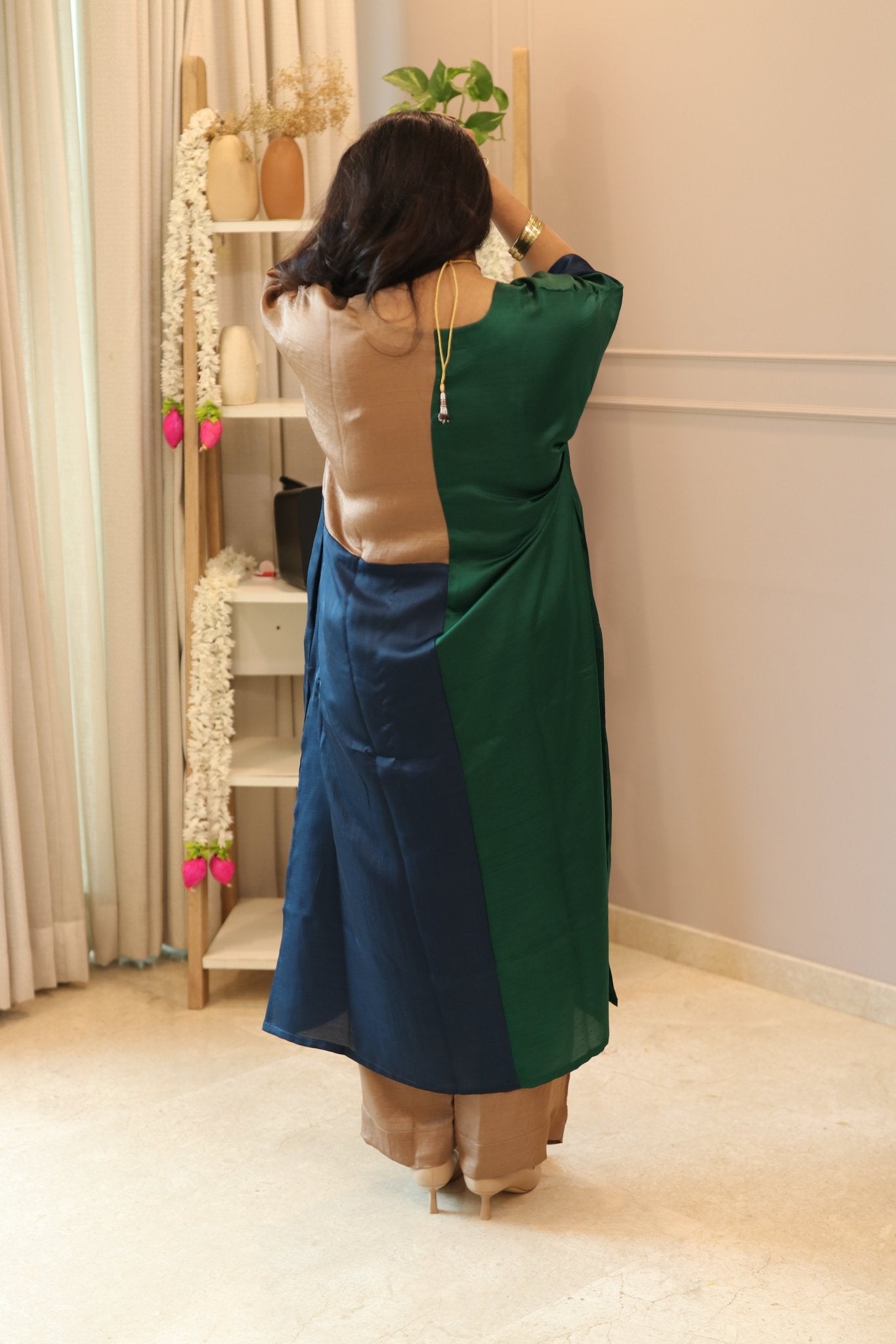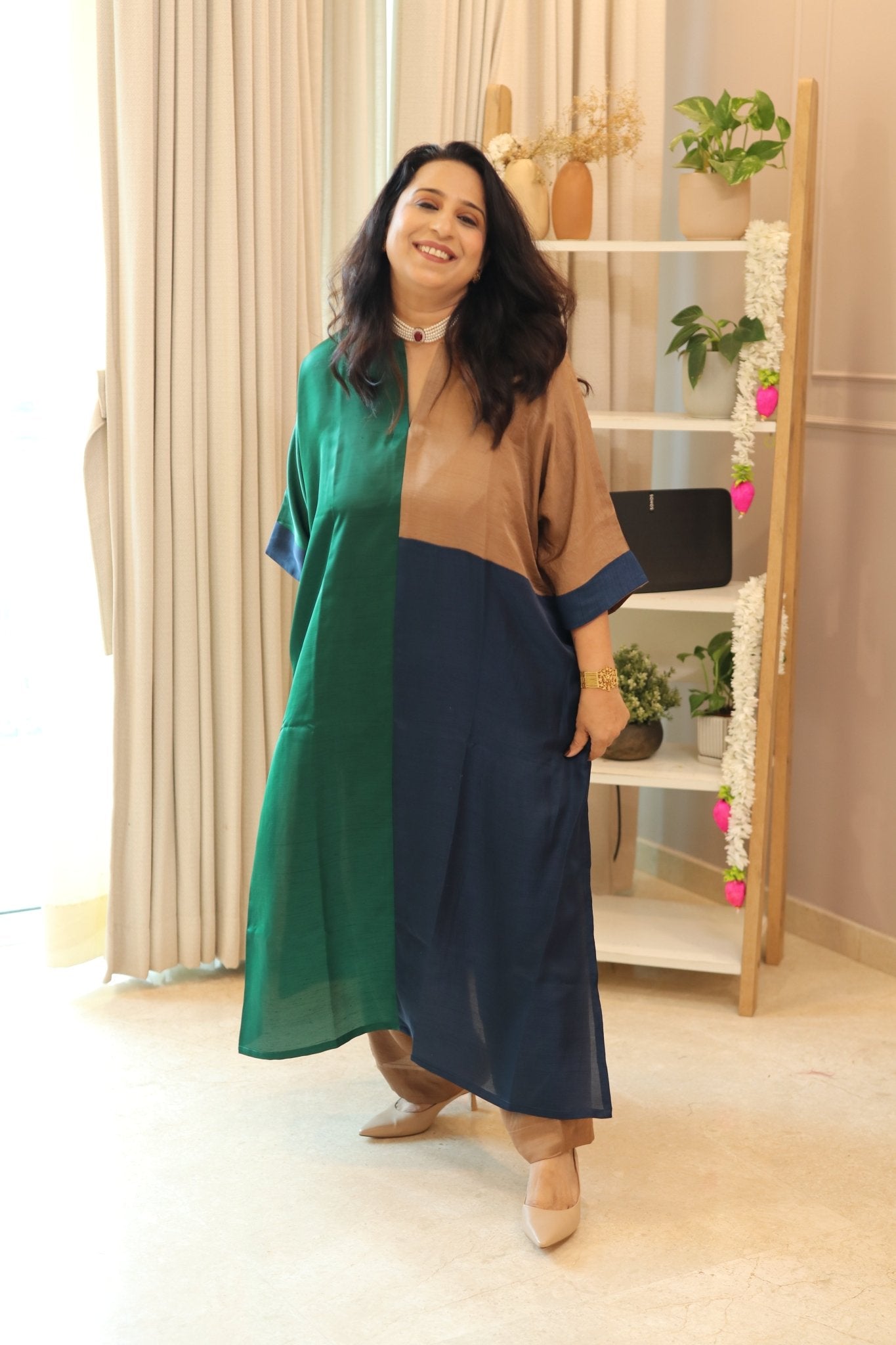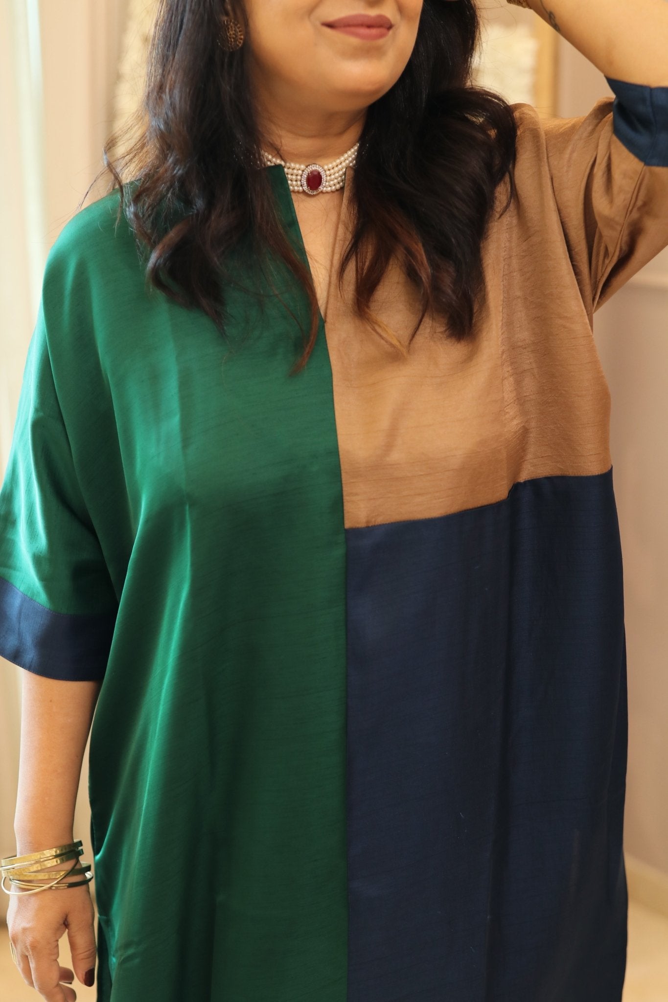 Discover refined simplicity with Tria in serene green. Crafted from sumptuous Nysa silk, this thoughtfully designed set combines understated elegance with everyday practicality. The slip-on tunic features a subtle keyhole V-neckline and three-quarter sleeves, while the A-line silhouette offers a flattering, graceful drape. Paired with mid-rise straight-fit pants featuring full elastication, this ensemble delivers seamless comfort without sacrificing sophistication.